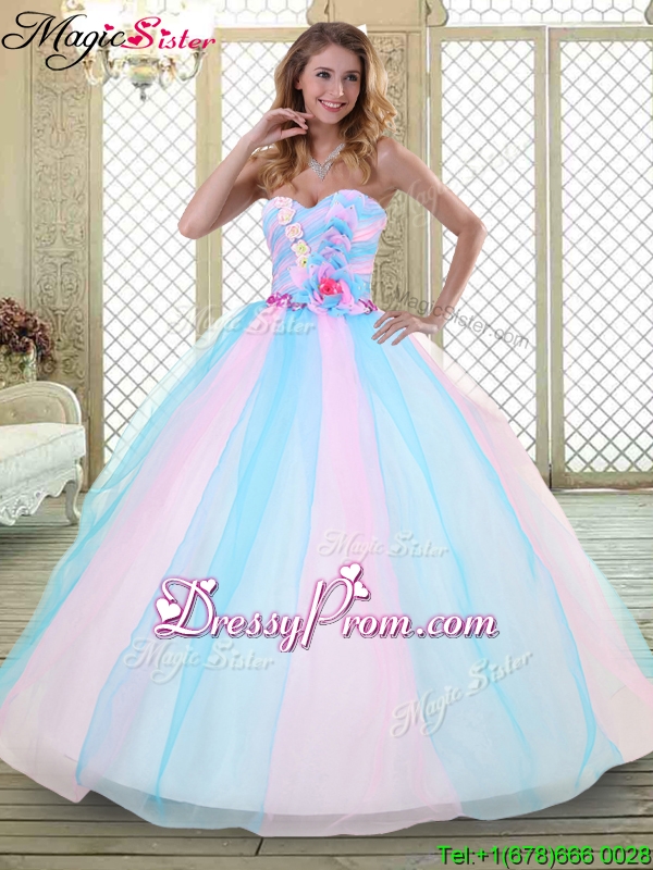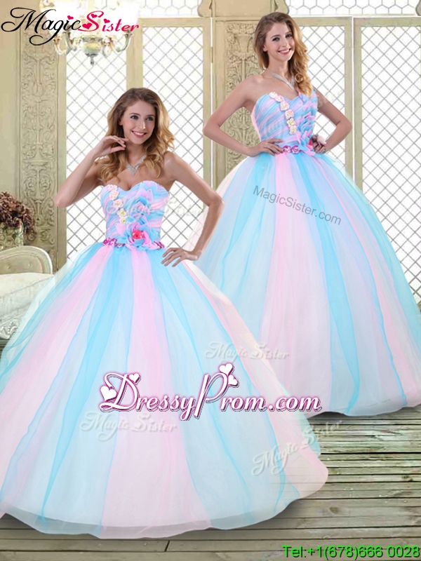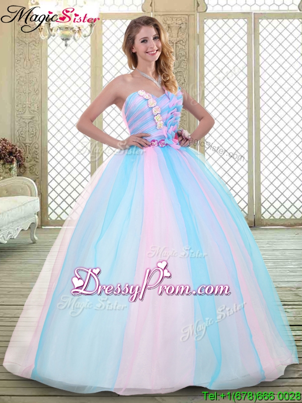 Neckline : SweetheartShown Color : Multi-colorSilhouette : Ball GownsSleeve Length : sleevelessHemline : floor lengthBack Detail : Lace upFabric : OrganzaEmbellishment : Hand Made FlowerOccasion : Military Ball,Sweet 16,QuinceaneraSeason : Spring,Summer,Fall,Winter