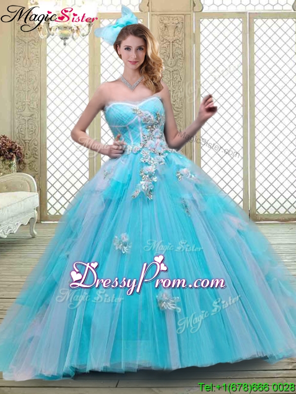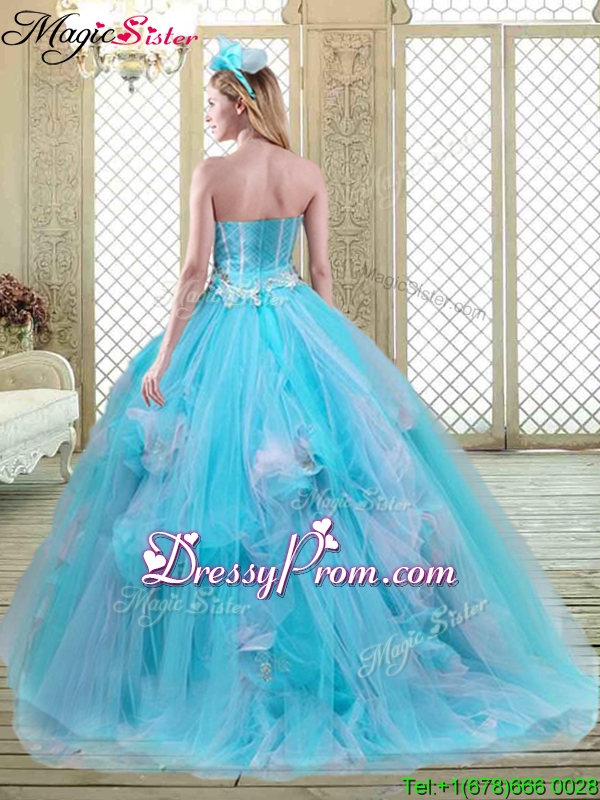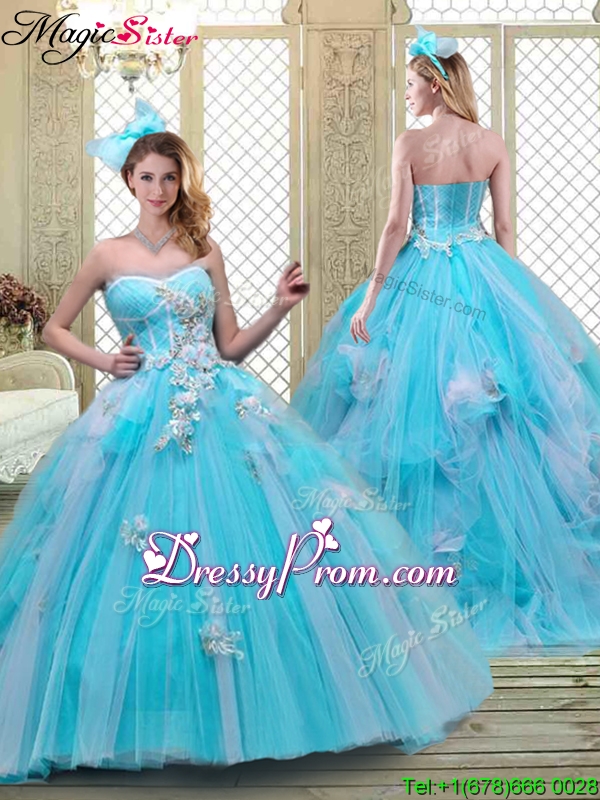 Neckline : SweetheartShown Color : Baby BlueSilhouette : Ball GownsSleeve Length : sleevelessHemline : with trainBack Detail : ZipperFabric : TulleEmbellishment : AppliquesOccasion : Military Ball,Sweet 16,QuinceaneraSeason : Spring,Summer,Fall,Winter
