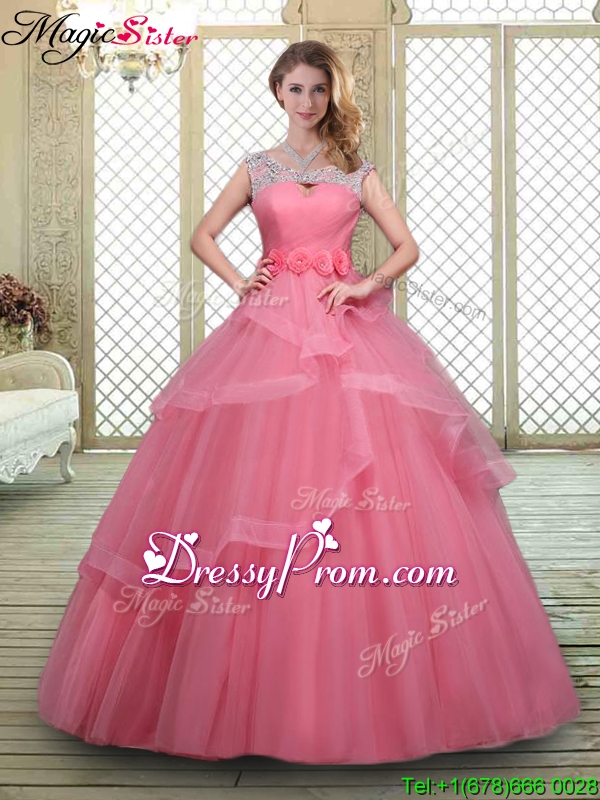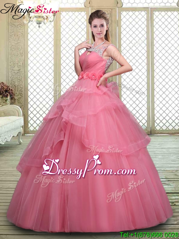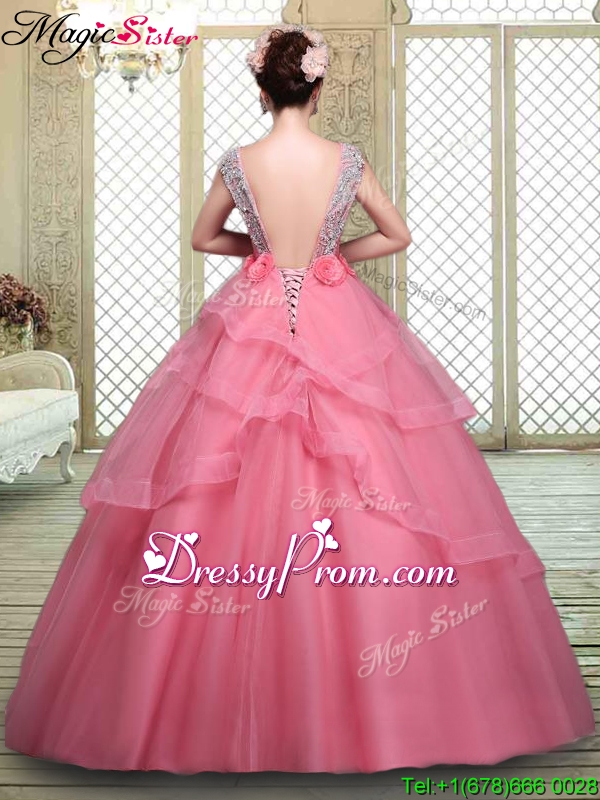 Neckline : ScoopShown Color : Pink Silhouette : Ball GownsSleeve Length : sleevelessHemline : floor lengthBack Detail : BacklessFabric : TulleEmbellishment : Beading,Hand Made FlowerOccasion : Military Ball,Sweet 16,QuinceaneraSeason : Spring,Summer,Fall,Winter