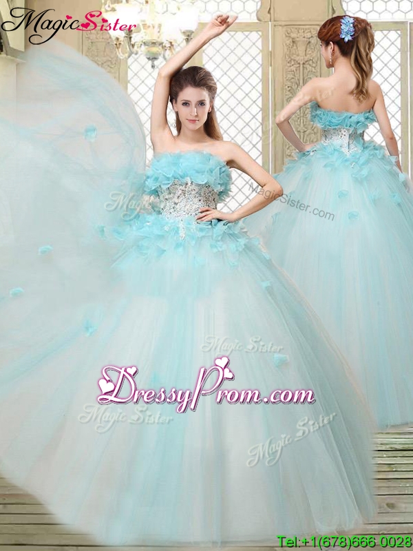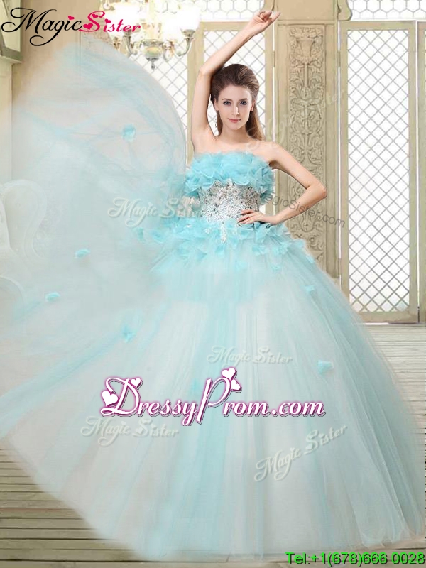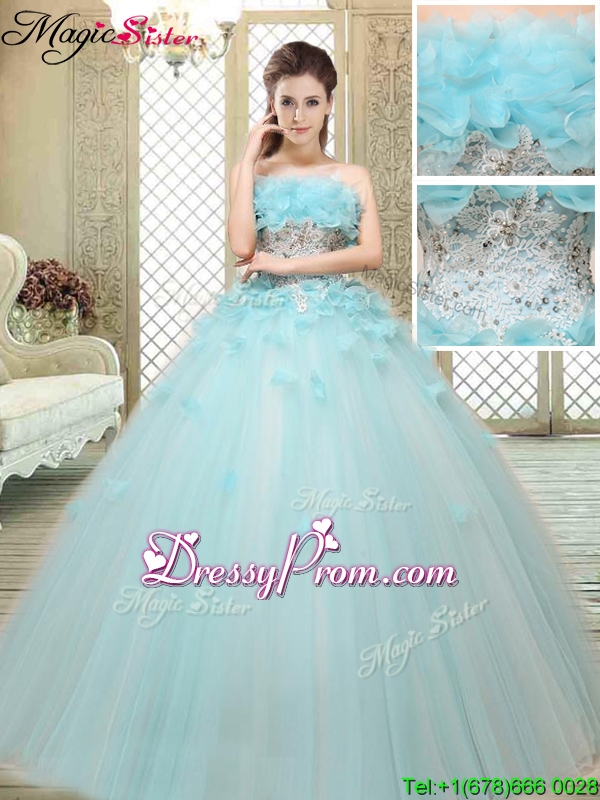 Neckline : StraplessShown Color : Light BlueSilhouette : Ball GownsSleeve Length : sleevelessHemline : floor lengthBack Detail : ZipperFabric : TulleEmbellishment : Appliques,RufflesOccasion : Military Ball,Sweet 16,QuinceaneraSeason : Summer,Fall,Winter