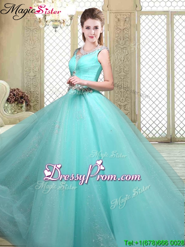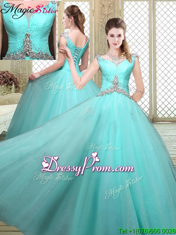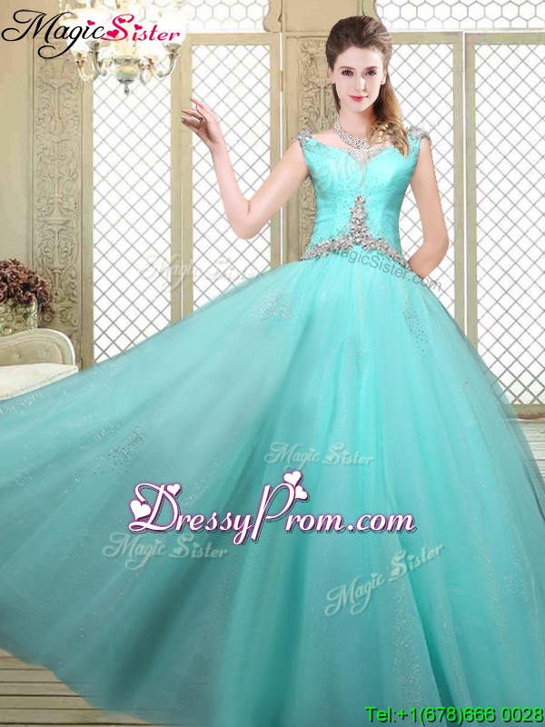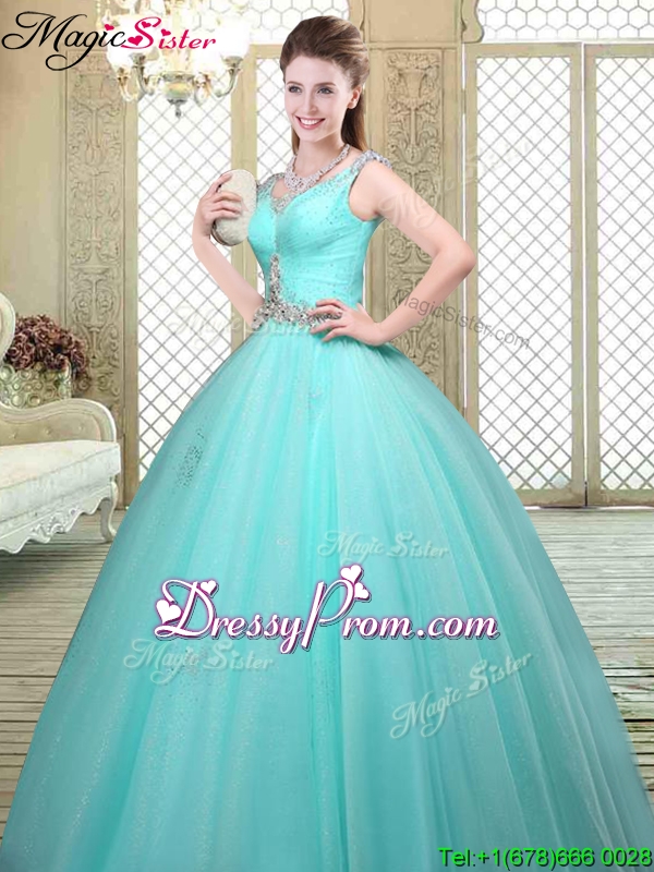 Neckline : StrapsShown Color : Aqua BlueSilhouette : Ball GownsSleeve Length : sleevelessHemline : floor lengthBack Detail : Lace upFabric : TulleEmbellishment : BeadingOccasion : Military Ball,Sweet 16,QuinceaneraSeason : Spring,Summer,Fall,Winter