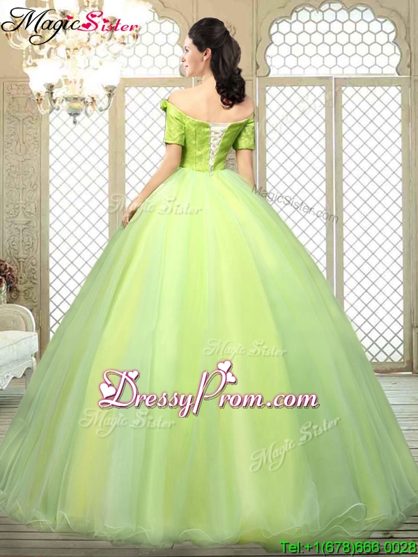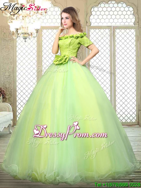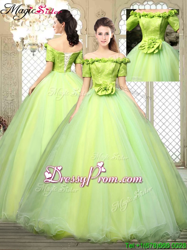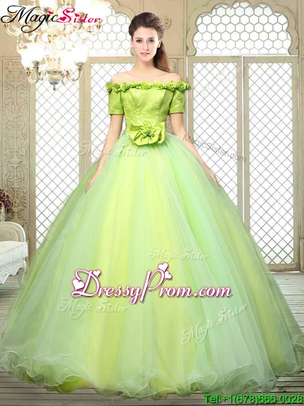 Neckline : Off the shoulder Shown Color : Yellow Green Silhouette : Ball Gowns Sleeve Length : short sleeves Hemline : floor length Back Detail : Lace up Fabric : Organza Embellishment : Hand Made Flower Occasion : Military Ball,Sweet 16,Quinceanera Season : Spring,Summer,Fall,Winter