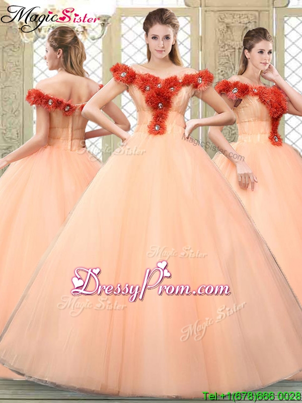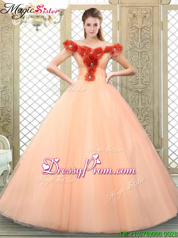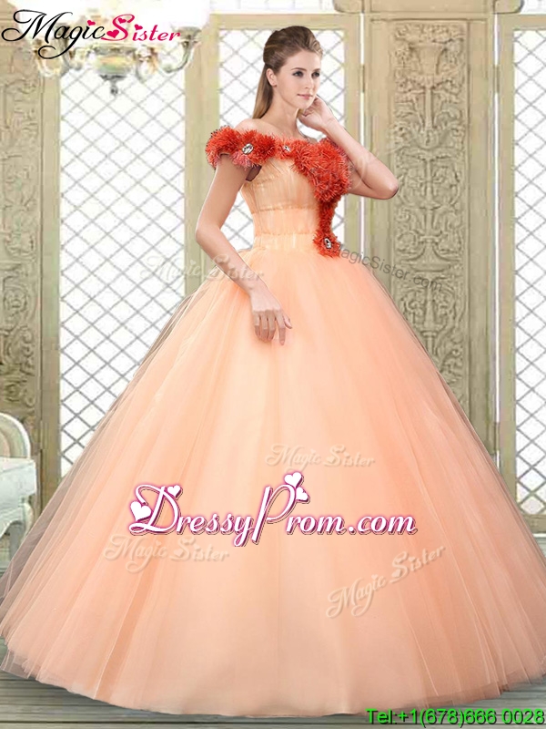 Neckline : Off the shoulder Shown Color : Baby Pink Silhouette : Ball Gowns Sleeve Length : cap sleeves Hemline : floor length Back Detail : Zipper Fabric : Tulle Embellishment : Hand Made Flower Occasion : Military Ball,Sweet 16,Quinceanera Season : Spring,Summer,Fall,Winter