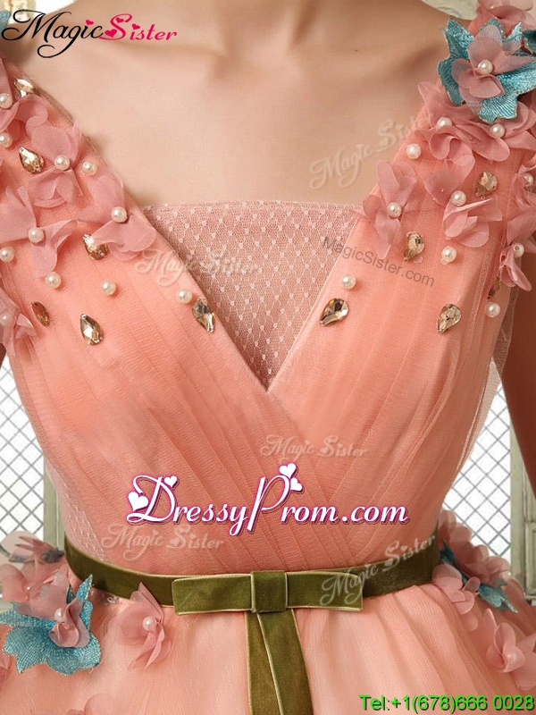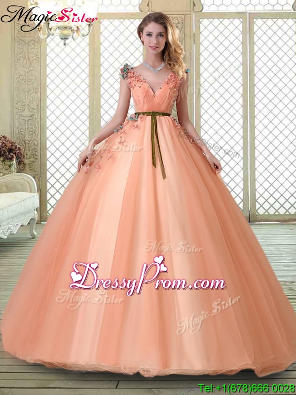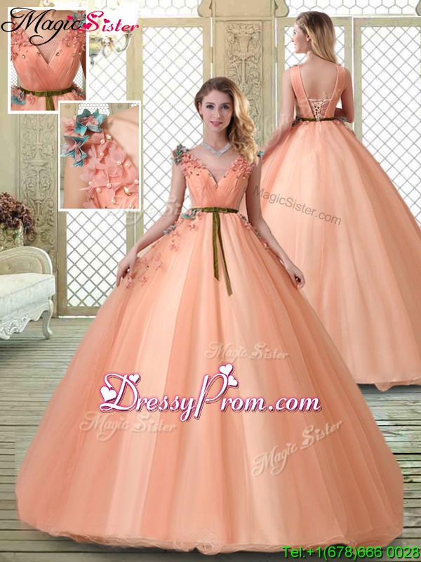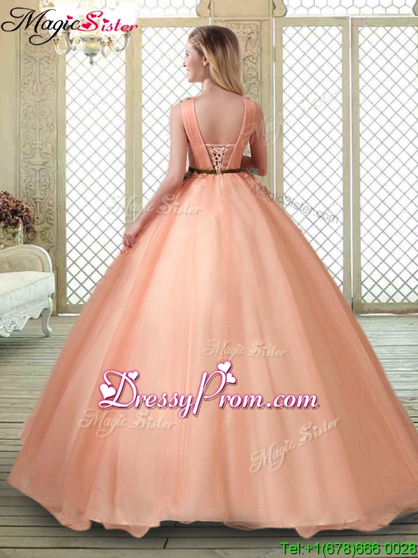 Neckline : V-neckShown Color : Baby PinkSilhouette : Ball GownsSleeve Length : sleevelessHemline : floor lengthBack Detail : Lace upFabric : TulleEmbellishment : Beading,Appliques,BeltOccasion : Military Ball,Sweet 16,QuinceaneraSeason : Spring,Summer,Fall,Winter