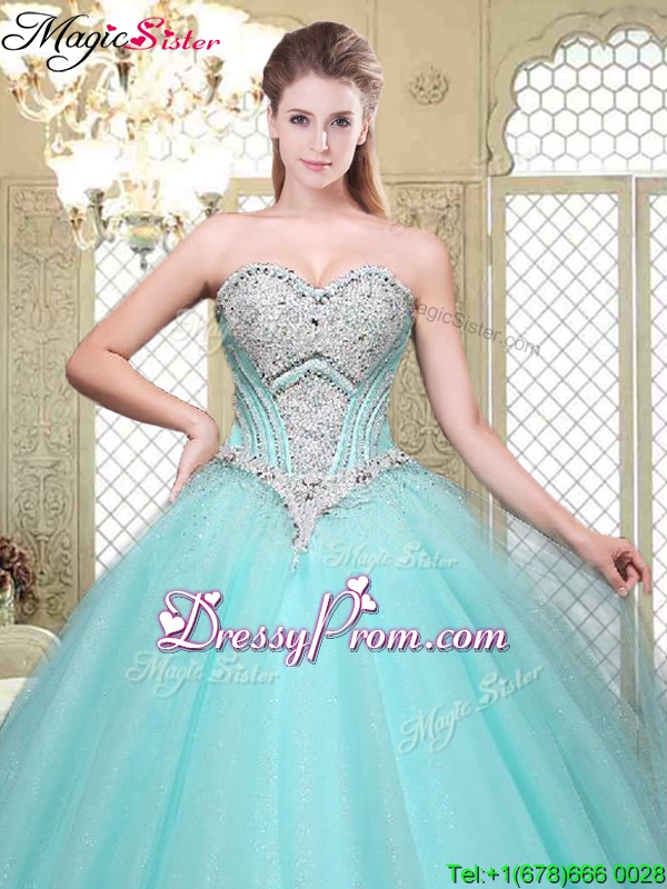 Neckline : SweetheartShown Color : Aqua BlueSilhouette : Ball GownsSleeve Length : sleevelessHemline : floor lengthBack Detail : Lace upFabric : TulleEmbellishment : BeadingOccasion : Military Ball,Sweet 16,QuinceaneraSeason : Spring,Summer,Fall,Winter