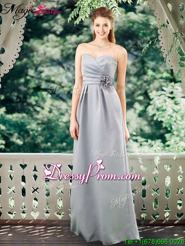 Neckline : SweetheartShown Color : SilverSilhouette : EmpireSleeve Length : sleevelessHemline : floor lengthBack Detail : ZipperFabric : ChiffonEmbellishment : Hand Made FlowerOccasion : Prom,Formal Evening,Party,Homecoming,Graduation,Wedding PartySeason : Spring,Summer,Fall,Winter