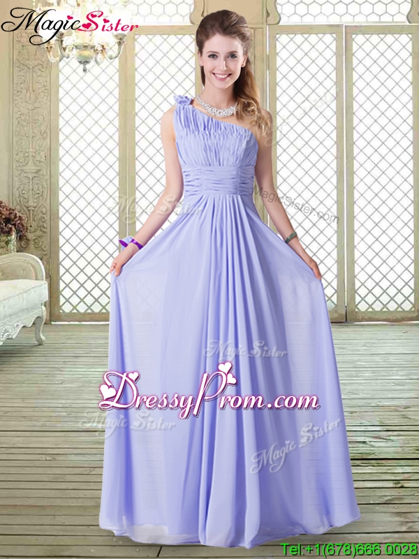 Neckline : One shoulderShown Color : LavenderSilhouette : EmpireSleeve Length : sleevelessHemline : floor lengthBack Detail : Lace upFabric : ChiffonEmbellishment : Ruching,Hand Made FlowerOccasion : Prom,Formal Evening,Party,Homecoming,Graduation,Wedding PartySeason : Spring,Summer,Fall,Winter