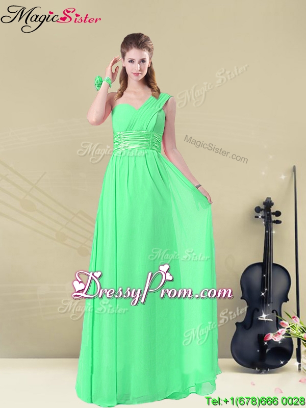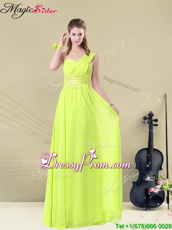 Neckline : One shoulderShown Color : Yellow GreenSilhouette : EmpireSleeve Length : sleevelessHemline : floor lengthFabric : ChiffonEmbellishment : Ruching,BeltOccasion : Prom,Formal Evening,Party,Homecoming,Graduation,Wedding PartySeason : Spring,Summer,Fall,Winter
