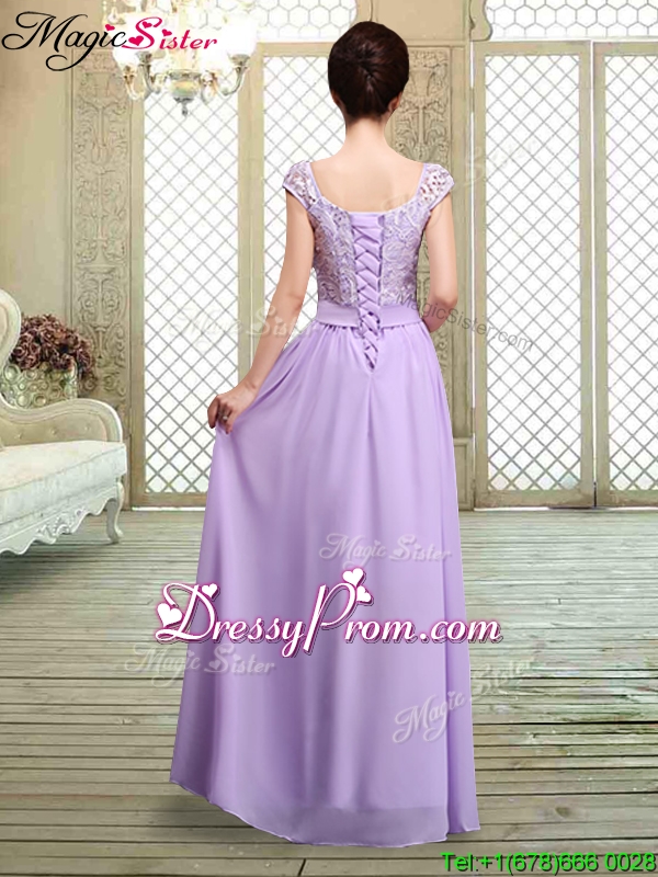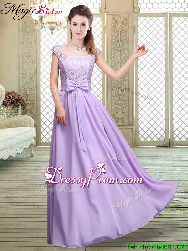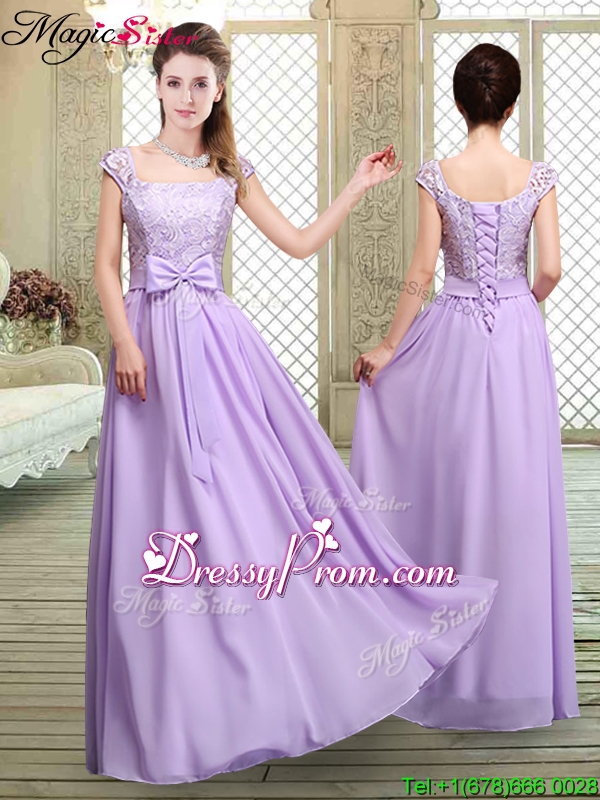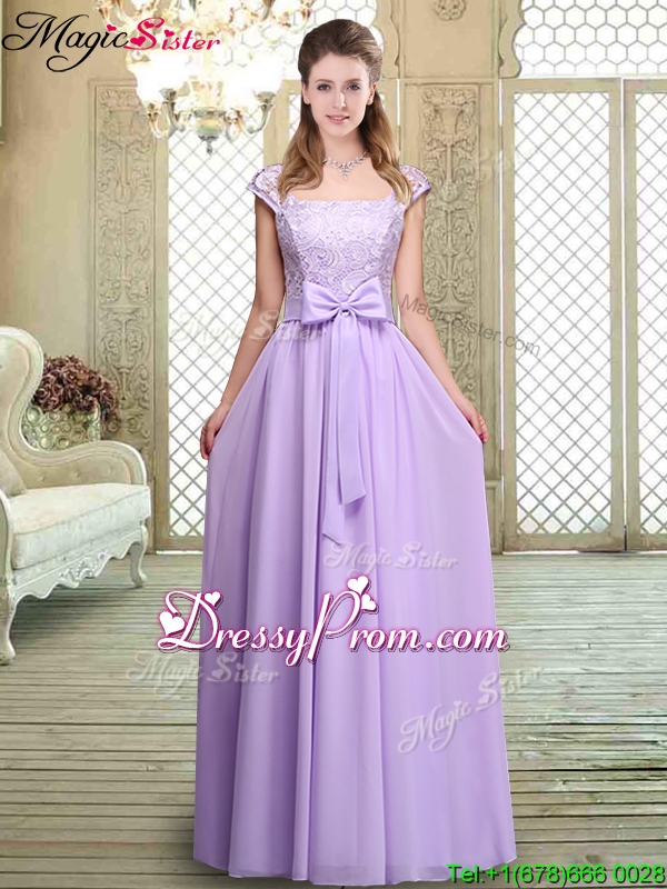 Neckline : SquareShown Color : LavenderSilhouette : EmpireSleeve Length : cap sleevesHemline : floor lengthBack Detail : Lace upFabric : ChiffonEmbellishment : Lace,Bowknot,BeltOccasion : Prom,Formal Evening,Party,Homecoming,Graduation,Wedding PartySeason : Spring,Summer,Fall,Winter