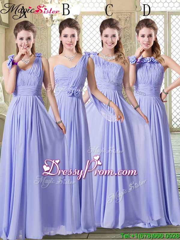 Neckline : StrapsShown Color : LavenderSilhouette : EmpireSleeve Length : sleevelessHemline : floor lengthFabric : ChiffonEmbellishment : Ruching,Hand Made FlowerOccasion : Prom,Formal Evening,Party,Homecoming,Graduation,Wedding PartySeason : Spring,Summer,Fall,Winter