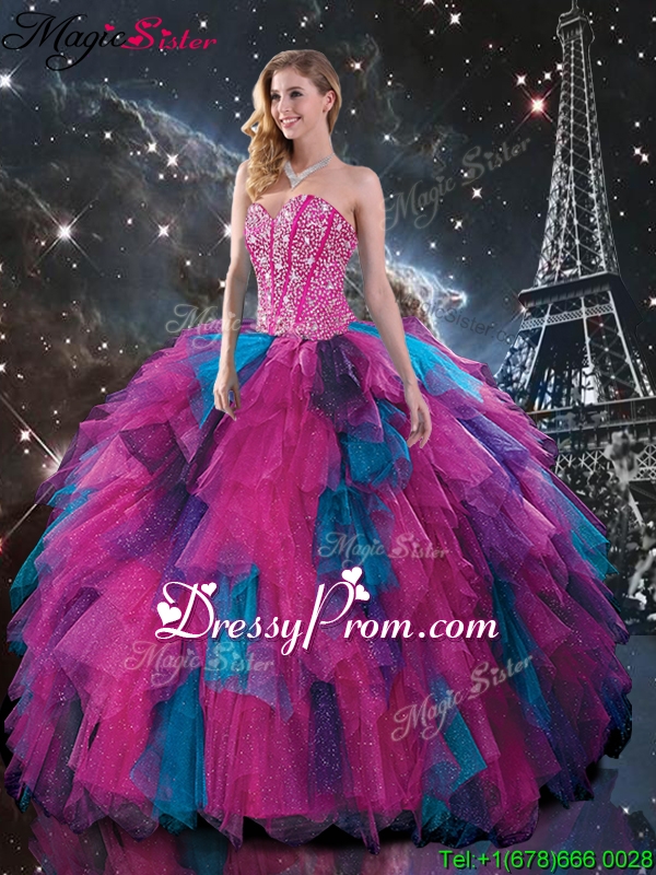 Neckline : SweetheartShown Color : Multi-colorSilhouette : Ball GownsSleeve Length : sleevelessHemline : floor lengthBack Detail : Lace upFabric : TulleEmbellishment : Beading,RufflesOccasion : Sweet 16,QuinceaneraSeason : Spring,Summer,Fall,Winter