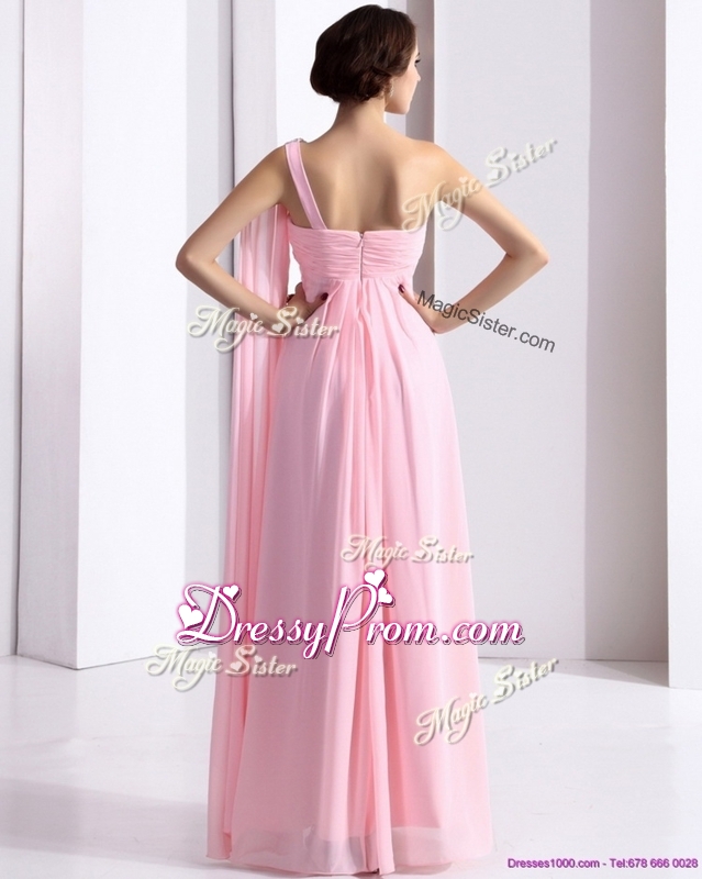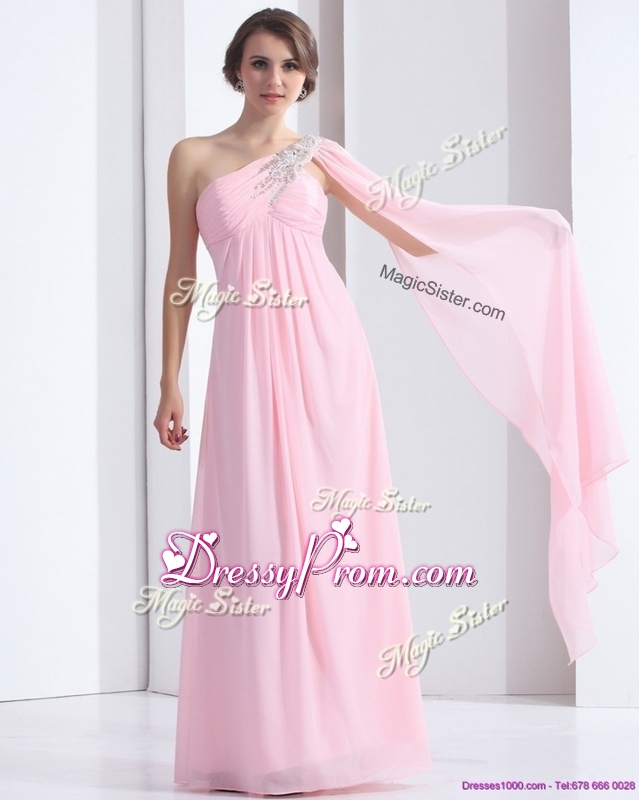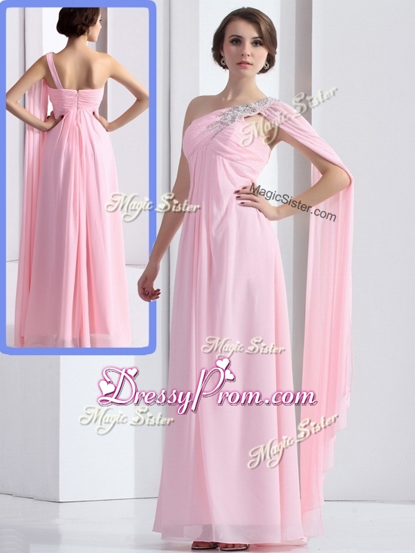 Neckline : One shoulderShown Color : Baby PinkSilhouette : EmpireSleeve Length : sleevelessHemline : floor lengthBack Detail : ZipperFabric : ChiffonEmbellishment : Beading,RuchingOccasion : Prom,Formal Evening,Homecoming,Graduation,PageantSeason : Spring,Summer,Fall,Winter