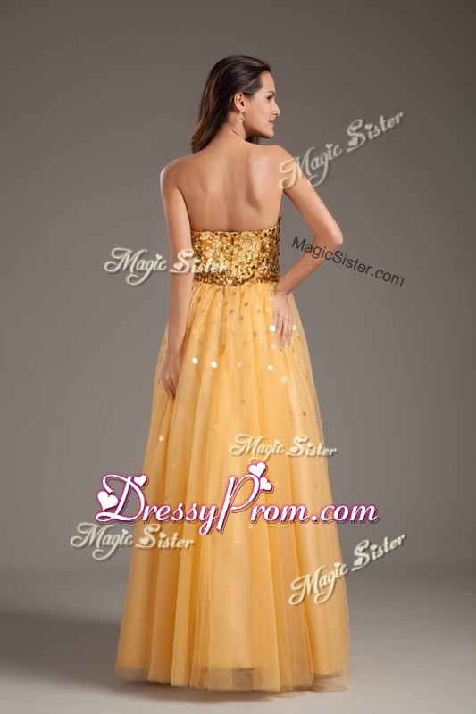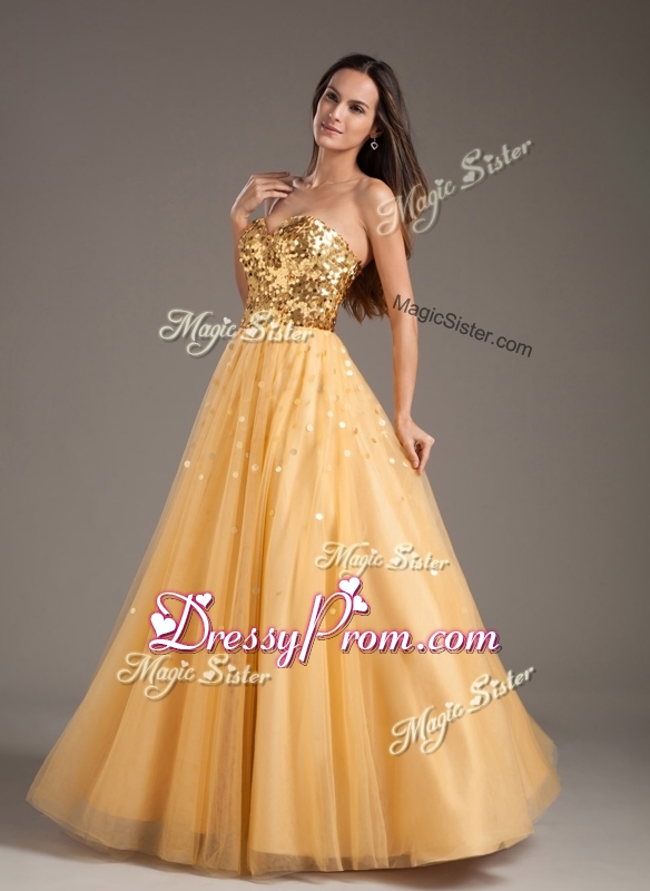 Neckline : SweetheartShown Color : GoldSilhouette : A-lineSleeve Length : sleevelessHemline : floor lengthBack Detail : ZipperFabric : TulleEmbellishment : SequinsOccasion : Prom,Formal Evening,Homecoming,Graduation,PageantSeason : Spring,Summer,Fall,Winter