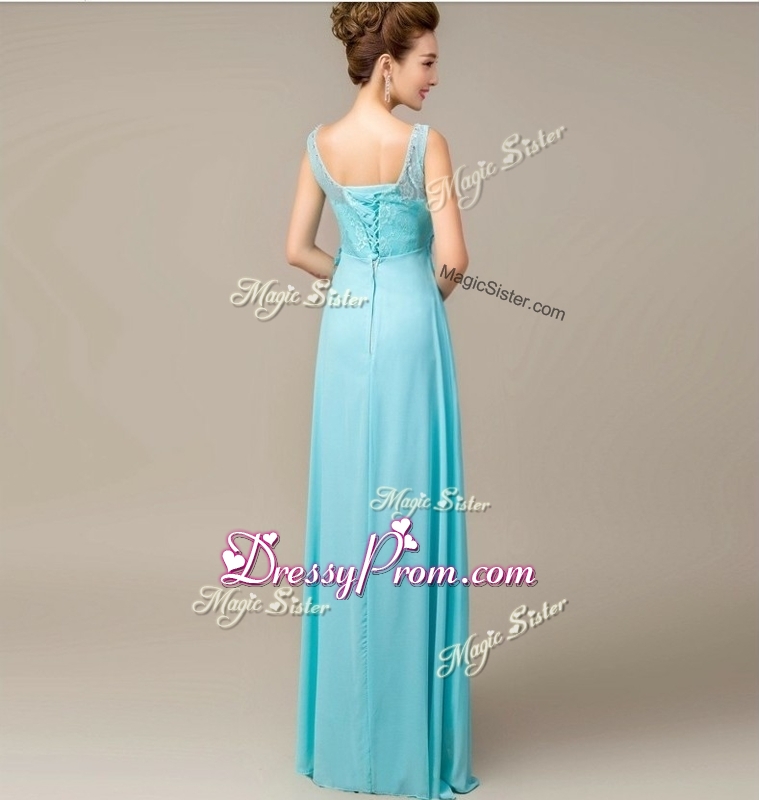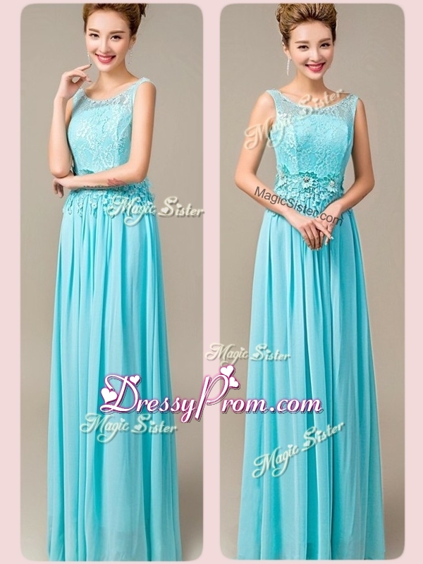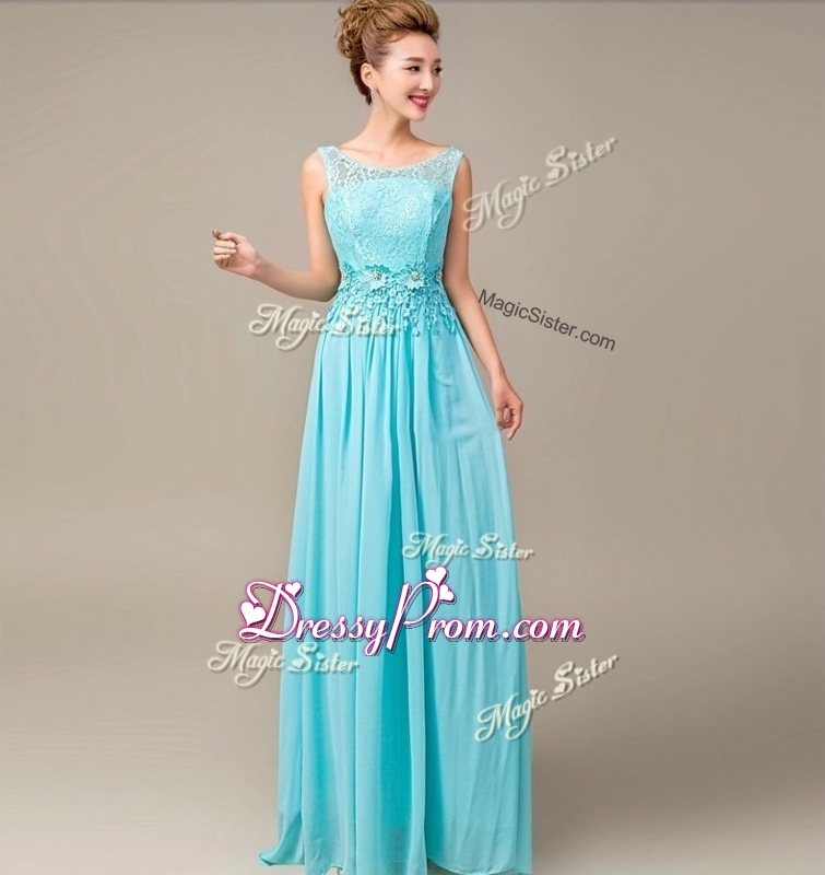 Neckline : ScoopShown Color : Aqua BlueSilhouette : EmpireSleeve Length : sleevelessHemline : floor lengthBack Detail : Lace upFabric : ChiffonEmbellishment : Lace,AppliquesOccasion : Prom,Formal Evening,PageantSeason : Spring,Summer,Fall,Winter