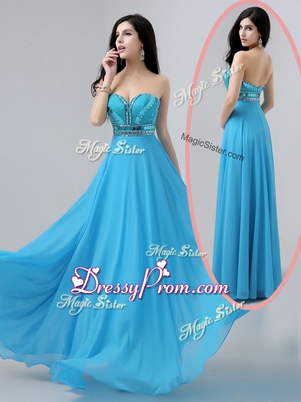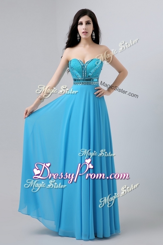 Neckline : SweetheartShown Color : Baby BlueSilhouette : EmpireSleeve Length : sleevelessHemline : floor lengthBack Detail : ZipperFabric : ChiffonEmbellishment : Beading,SequinsOccasion : Prom,Formal Evening,Homecoming,Graduation,PageantSeason : Spring,Summer,Fall,Winter