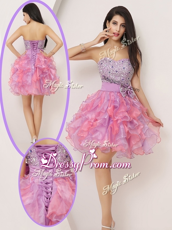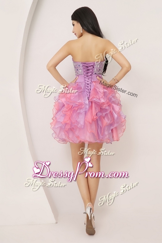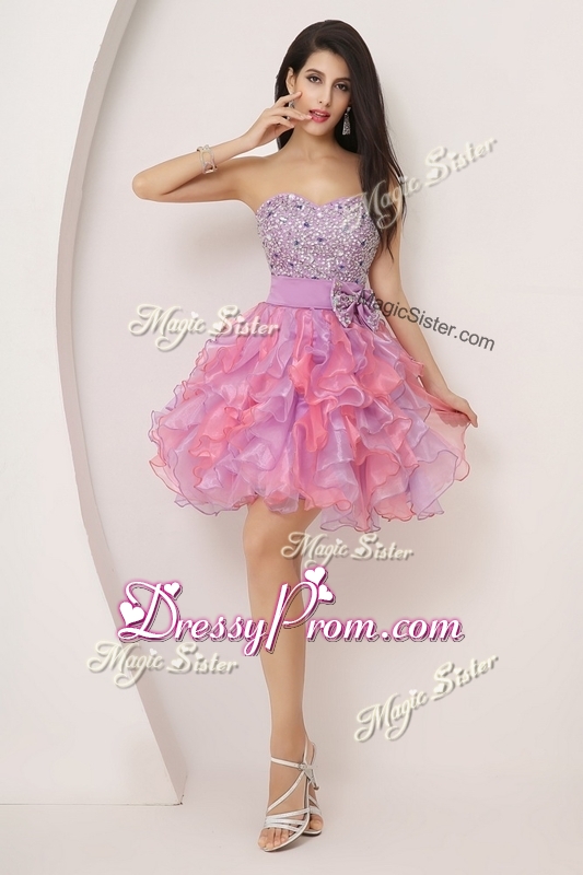 Neckline : SweetheartSilhouette : A-lineSleeve Length : sleevelessHemline : mini lengthBack Detail : Lace upFabric : OrganzaEmbellishment : Beading,Ruffles,BowknotOccasion : Prom,Party,Cocktail,Homecoming,GraduationSeason : Spring,Summer,Fall
