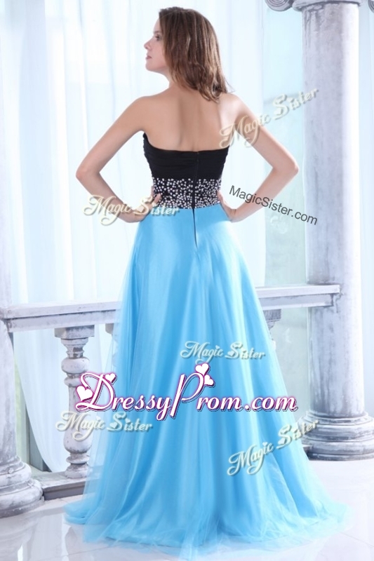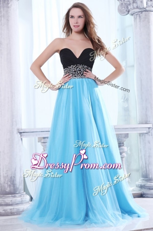 Neckline : SweetheartShown Color : Baby BlueSilhouette : A-lineSleeve Length : sleevelessHemline : with trainBack Detail : ZipperFabric : Elastic Woven Satin,TulleEmbellishment : BeadingOccasion : Prom,Formal Evening,Homecoming,Graduation,PageantSeason : Spring,Summer,Fall,Winter