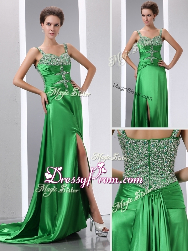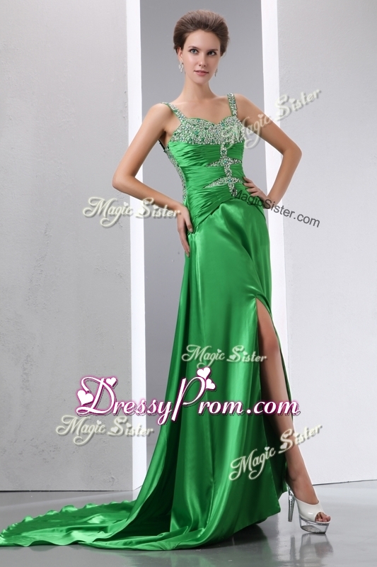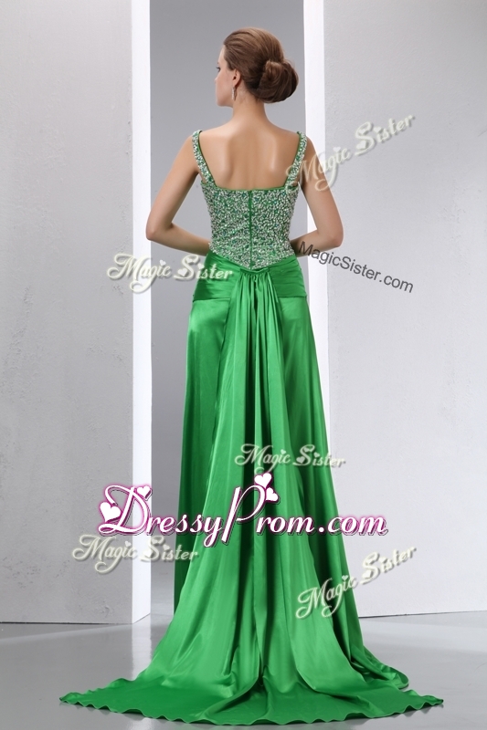 Neckline : StrapsShown Color : GreenSilhouette : Column/SheathSleeve Length : sleevelessHemline : with trainBack Detail : ZipperFabric : Elastic Woven SatinEmbellishment : BeadingOccasion : Prom,Formal Evening,Homecoming,Graduation,PageantSeason : Spring,Summer,Fall,Winter