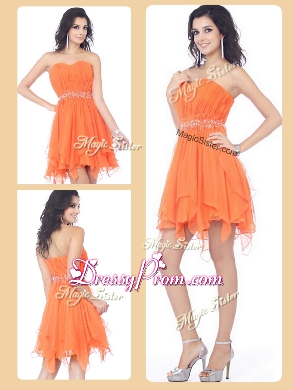 Neckline : SweetheartShown Color : Orange RedSilhouette : Column/SheathSleeve Length : sleevelessHemline : mini lengthBack Detail : ZipperFabric : ChiffonEmbellishment : Beading,RuchingOccasion : Prom,Party,Cocktail,Homecoming,GraduationSeason : Spring,Summer,Fall