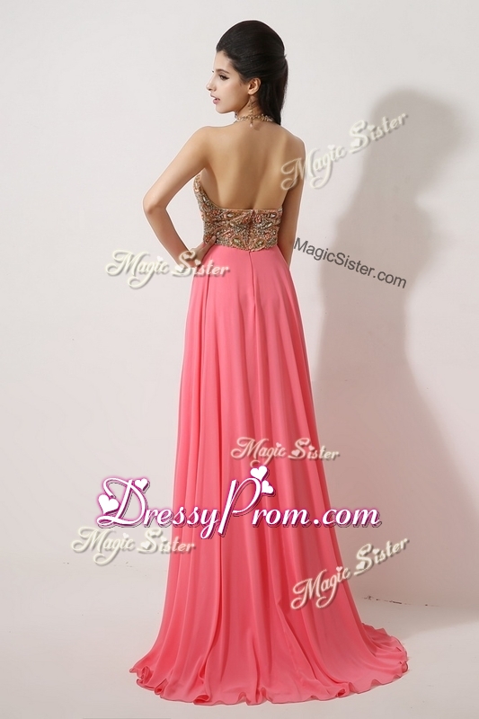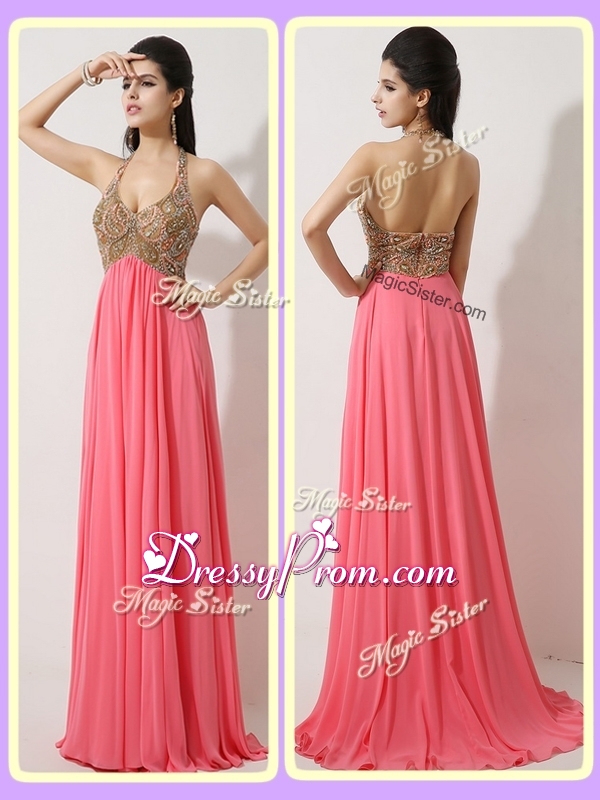Neckline : Halter topShown Color : Watermelon RedSilhouette : EmpireSleeve Length : sleevelessBack Detail : ZipperFabric : ChiffonEmbellishment : Beading,SequinsOccasion : Prom,Formal Evening,Homecoming,Graduation,PageantSeason : Spring,Summer,Fall,Winter