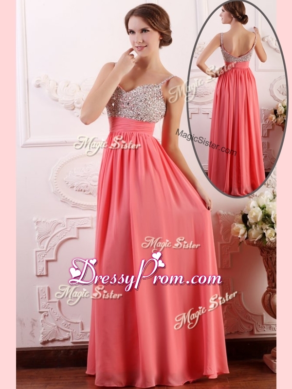 Neckline : StrapsShown Color : Watermelon RedSilhouette : EmpireSleeve Length : sleevelessHemline : floor lengthBack Detail : Side zipperFabric : ChiffonEmbellishment : BeadingOccasion : Prom,Formal Evening,Homecoming,Graduation,PageantSeason : Spring,Summer,Fall,Winter