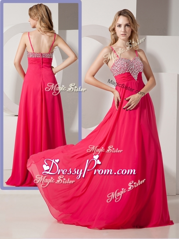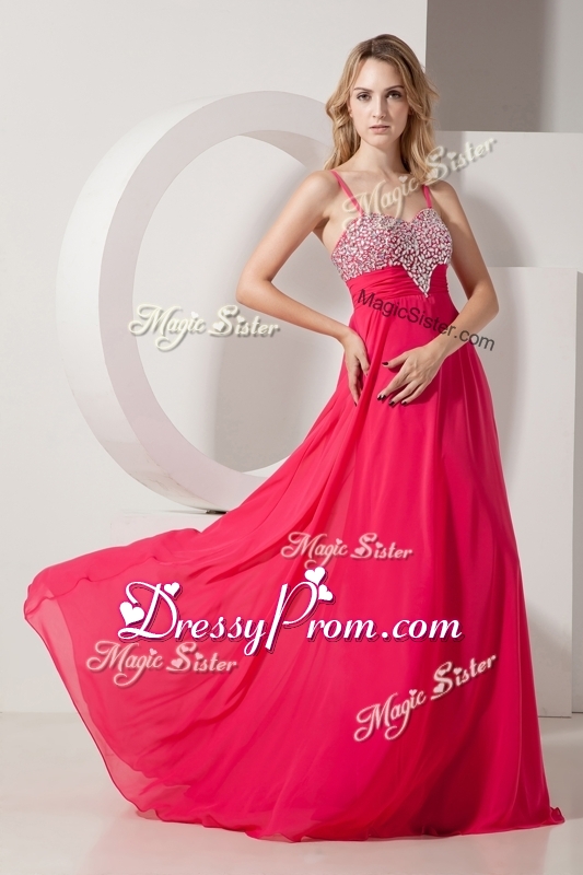 Neckline : Spaghetti strapsShown Color : Coral RedSilhouette : EmpireSleeve Length : sleevelessHemline : floor lengthBack Detail : ZipperFabric : ChiffonEmbellishment : BeadingOccasion : Prom,Formal Evening,Homecoming,Graduation,PageantSeason : Spring,Summer,Fall,Winter