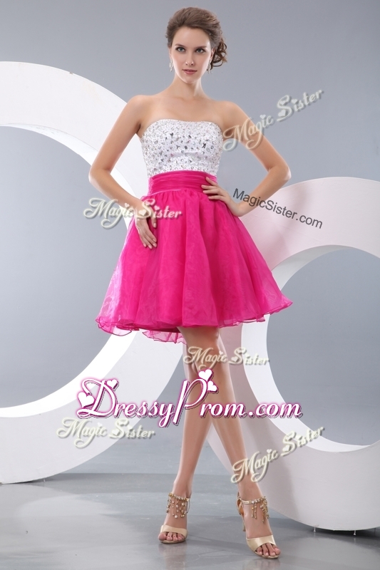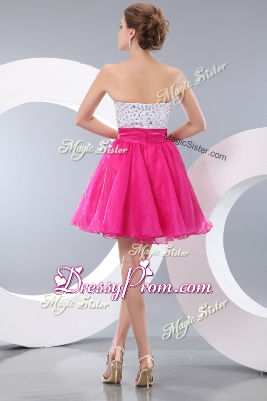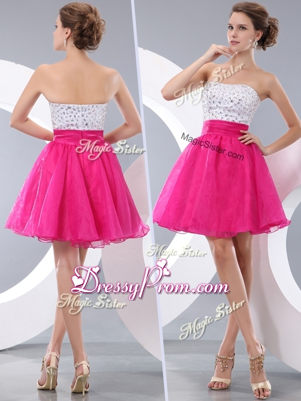 Neckline : StraplessShown Color : Hot PinkSilhouette : A-lineSleeve Length : sleevelessHemline : mini lengthBack Detail : ZipperFabric : OrganzaEmbellishment : BeadingOccasion : Prom,Party,Cocktail,Homecoming,GraduationSeason : Spring,Summer,Fall
