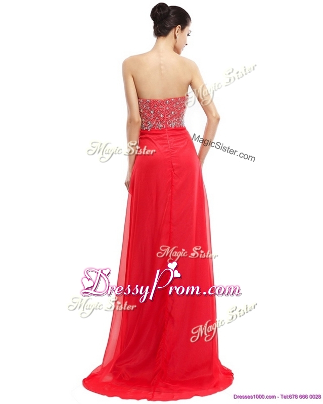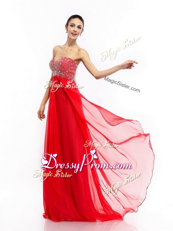 Neckline : SweetheartShown Color : RedSilhouette : Column/SheathSleeve Length : sleevelessHemline : with trainBack Detail : ZipperFabric : ChiffonEmbellishment : BeadingOccasion : Prom,Formal Evening,Homecoming,Graduation,PageantSeason : Spring,Summer,Fall,Winter
