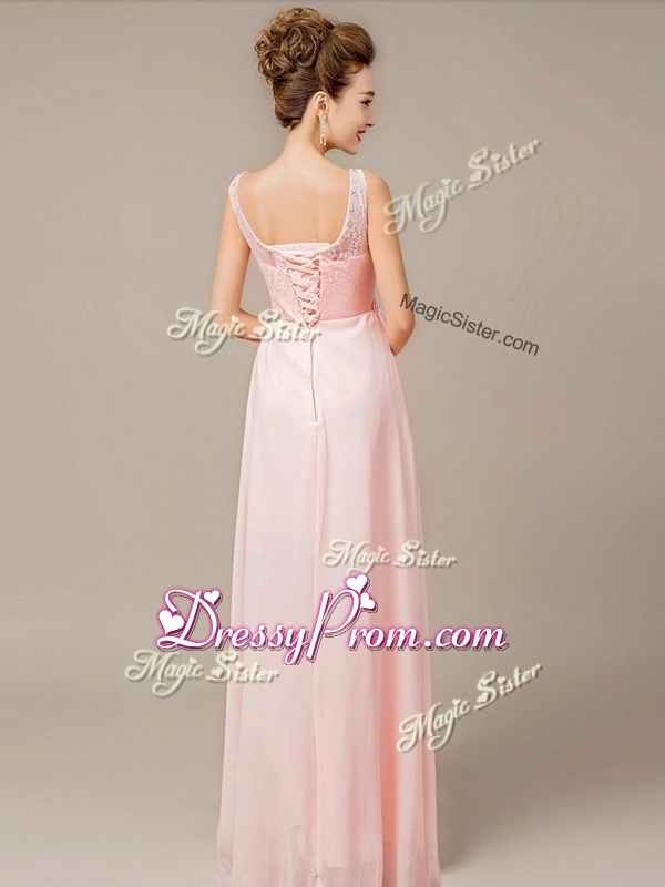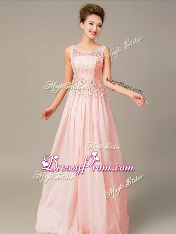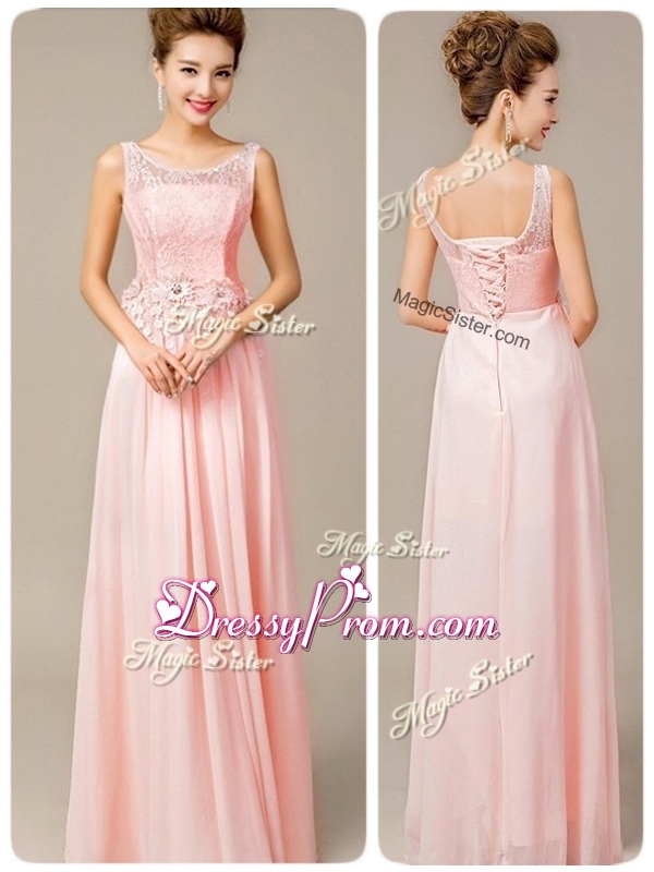 Neckline : ScoopShown Color : Pink Silhouette : EmpireSleeve Length : sleevelessHemline : floor lengthBack Detail : Lace upFabric : ChiffonEmbellishment : Lace,AppliquesOccasion : Prom,Formal Evening,PageantSeason : Spring,Summer,Fall,Winter