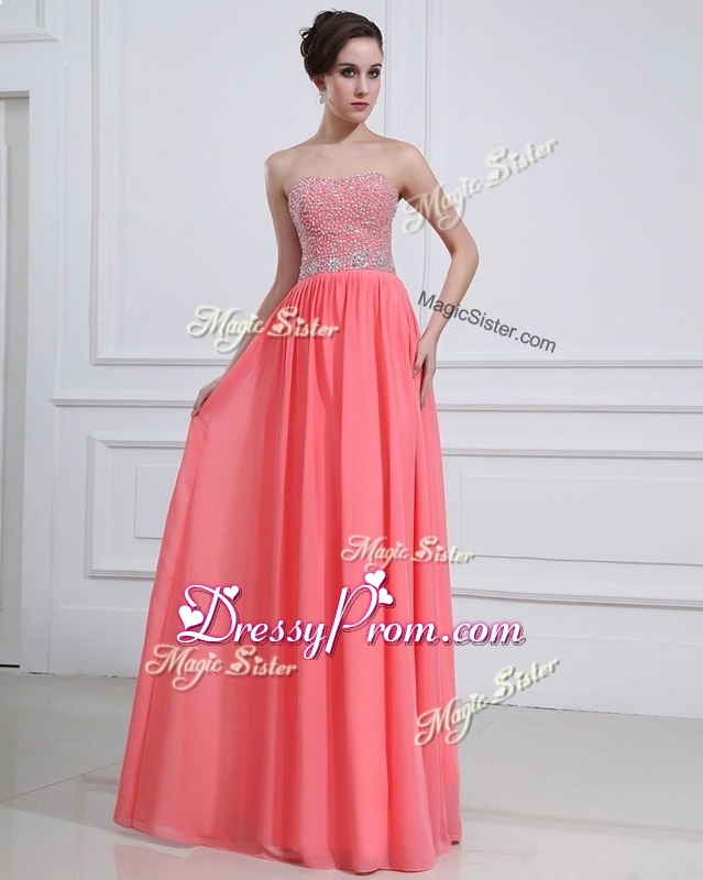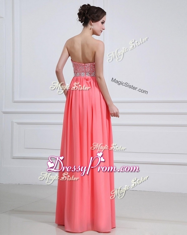Neckline : SweetheartShown Color : Watermelon RedSilhouette : EmpireSleeve Length : sleevelessHemline : floor lengthBack Detail : ZipperFabric : ChiffonEmbellishment : BeadingOccasion : Prom,Formal Evening,Homecoming,Graduation,PageantSeason : Spring,Summer,Fall,Winter