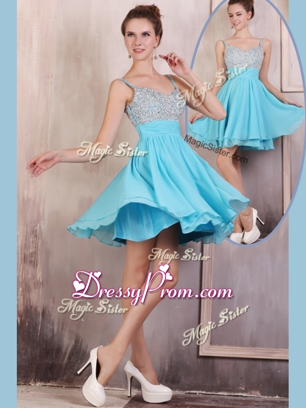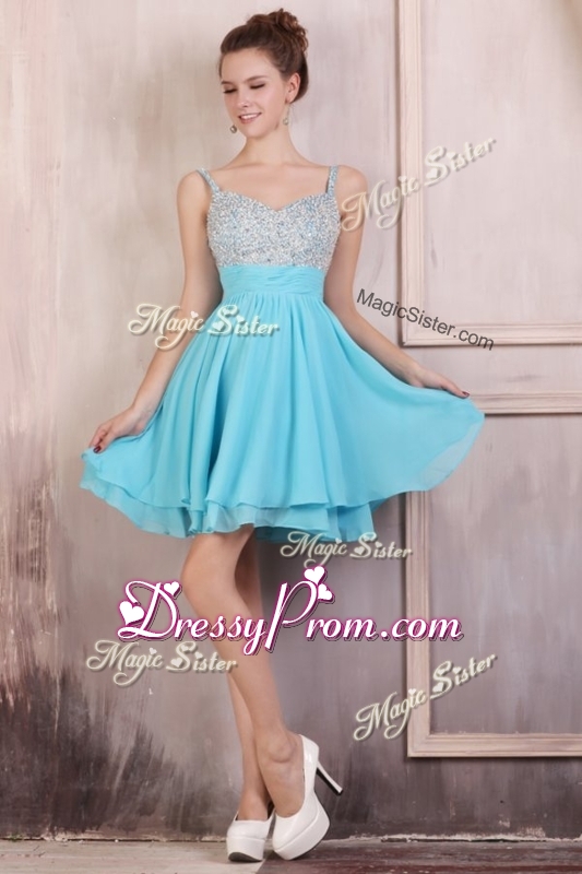 Neckline : Straps Shown Color : Aqua Blue Silhouette : Short Sleeve Length : sleeveless Hemline : mini length Back Detail : Side zipper Fabric : Chiffon Embellishment : Beading Occasion : Prom,Party,Cocktail,Homecoming,Graduation Season : Spring,Summer,Fall