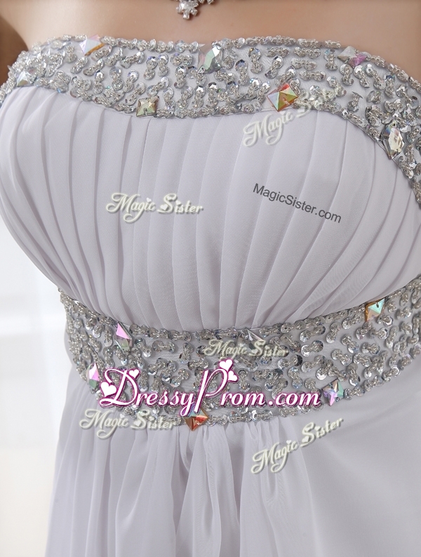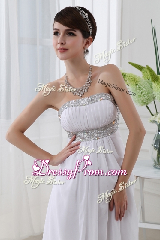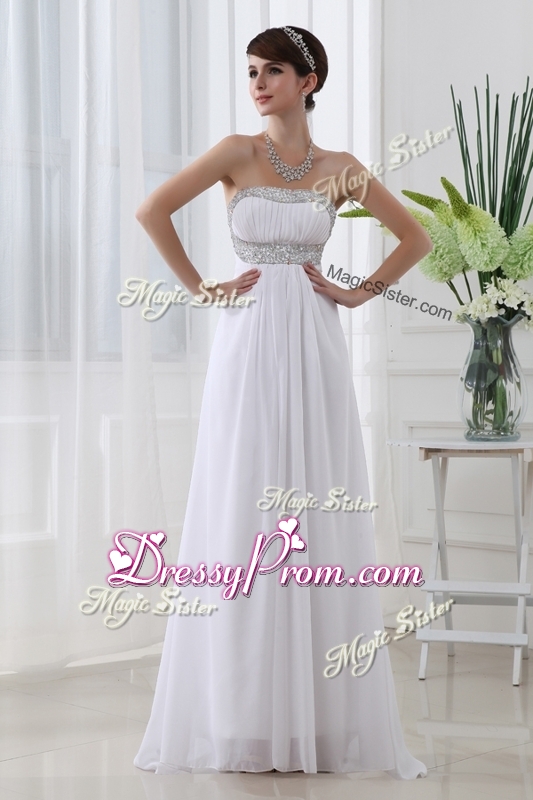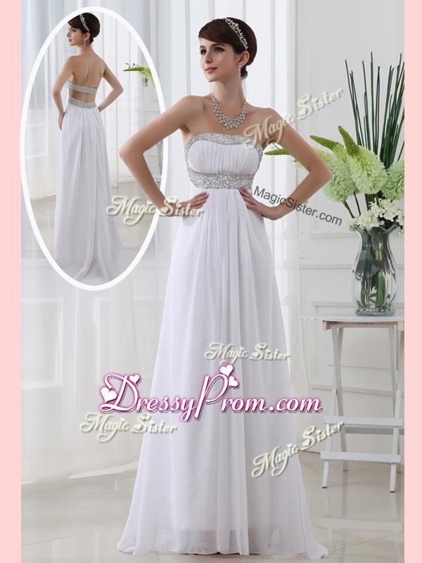 Neckline : StraplessShown Color : WhiteSilhouette : EmpireSleeve Length : sleevelessHemline : with trainBack Detail : BacklessFabric : ChiffonEmbellishment : BeadingOccasion : Prom,Formal Evening,Homecoming,Graduation,PageantSeason : Spring,Summer,Fall,Winter
