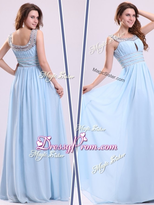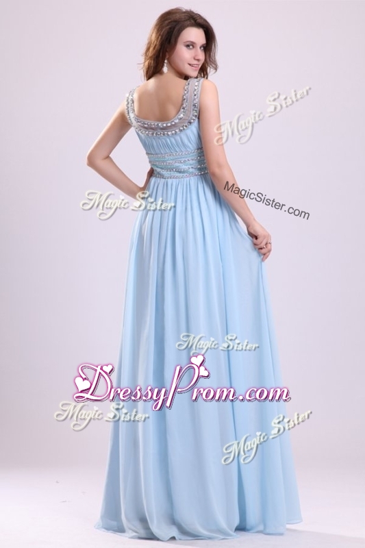 Neckline : ScoopShown Color : Light BlueSilhouette : EmpireSleeve Length : sleevelessHemline : floor lengthBack Detail : Lace upFabric : ChiffonEmbellishment : BeadingOccasion : Prom,Formal Evening,Homecoming,Graduation,PageantSeason : Spring,Summer,Fall,Winter