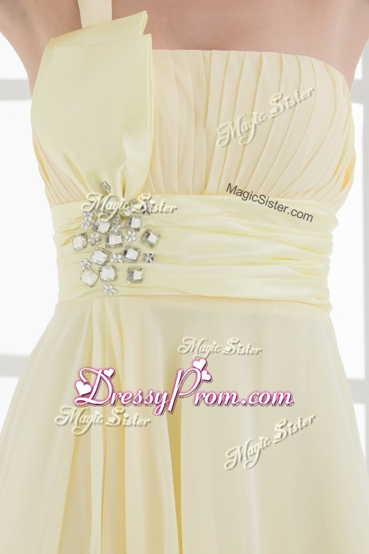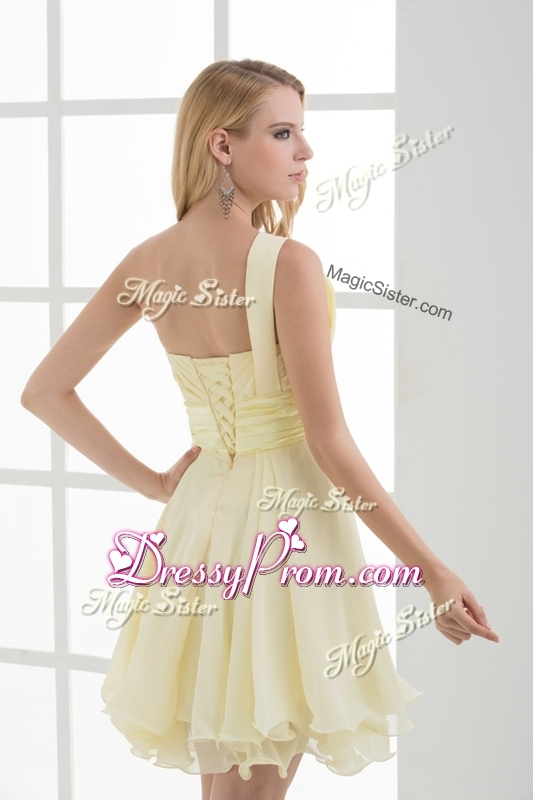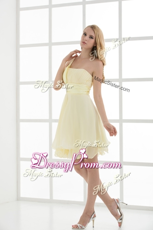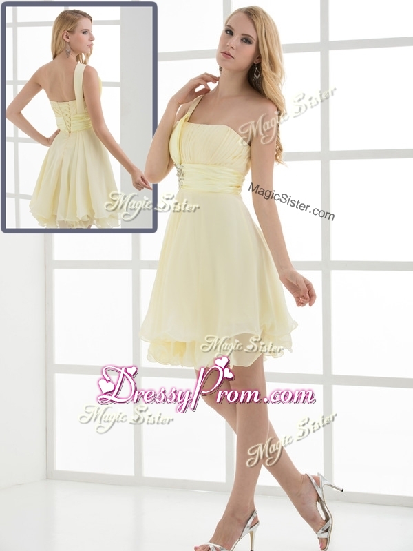 Neckline : One shoulderShown Color : YellowSilhouette : ShortSleeve Length : sleevelessHemline : mini lengthBack Detail : Lace upFabric : ChiffonEmbellishment : Beading,BeltOccasion : Prom,Party,Cocktail,Homecoming,GraduationSeason : Spring,Summer,Fall