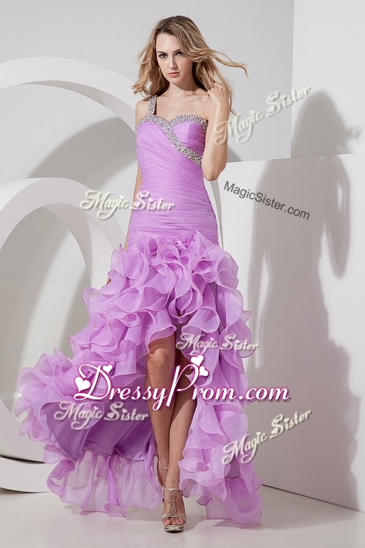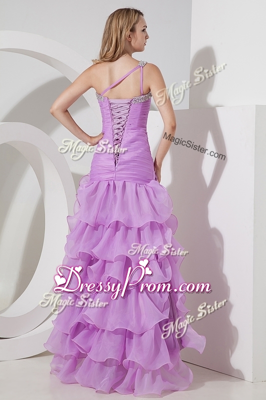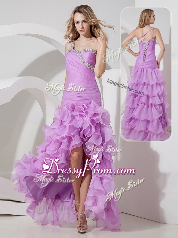 Neckline : One shoulderShown Color : LilacSilhouette : Column/sheathSleeve Length : sleevelessHemline : high lowBack Detail : Lace upFabric : OrganzaEmbellishment : Beading,Ruffled LayersOccasion : Prom,Party,Cocktail,Homecoming,GraduationSeason : Spring,Summer,Fall