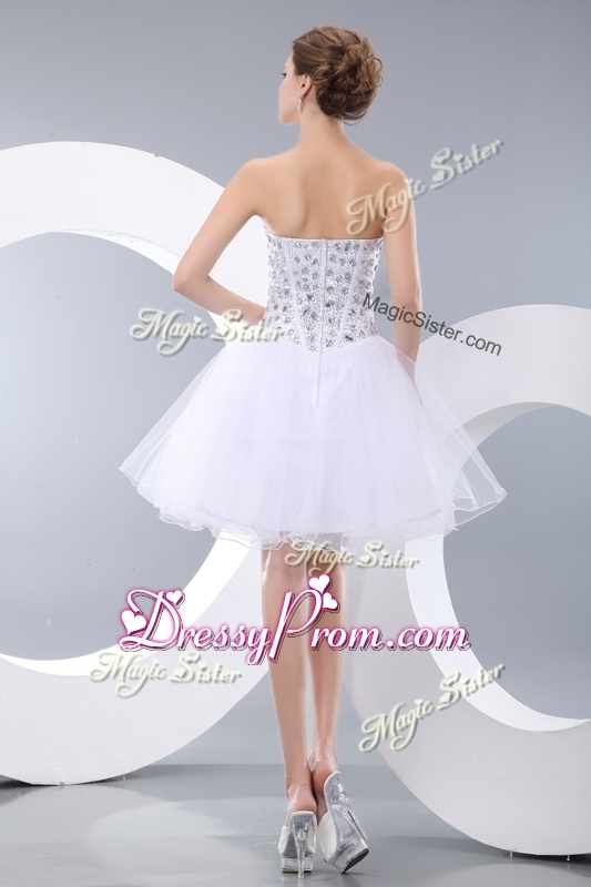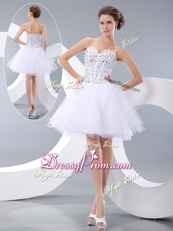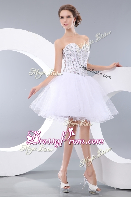 Neckline : SweetheartShown Color : WhiteSilhouette : ShortSleeve Length : sleevelessHemline : mini lengthBack Detail : ZipperFabric : OrganzaEmbellishment : BeadingOccasion : Prom,Party,Cocktail,Homecoming,GraduationSeason : Spring,Summer,Fall