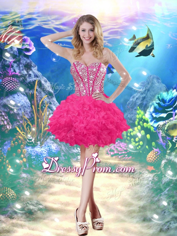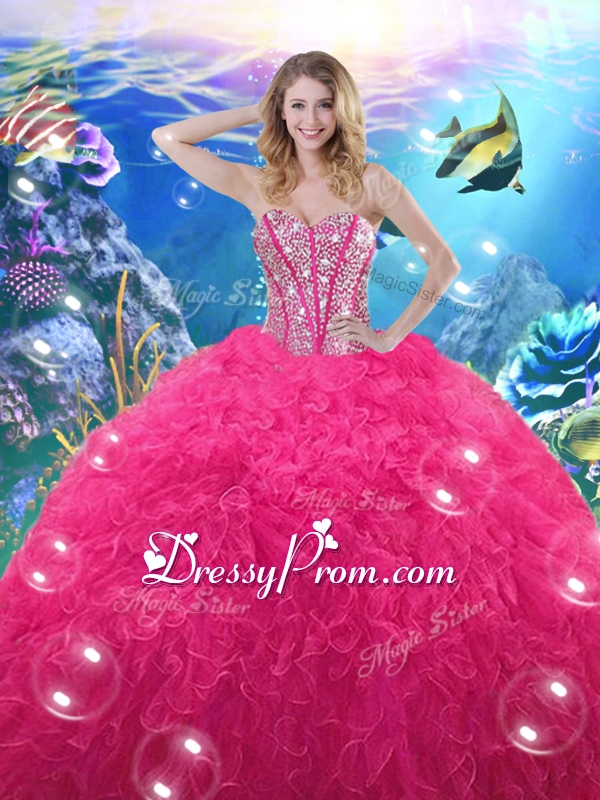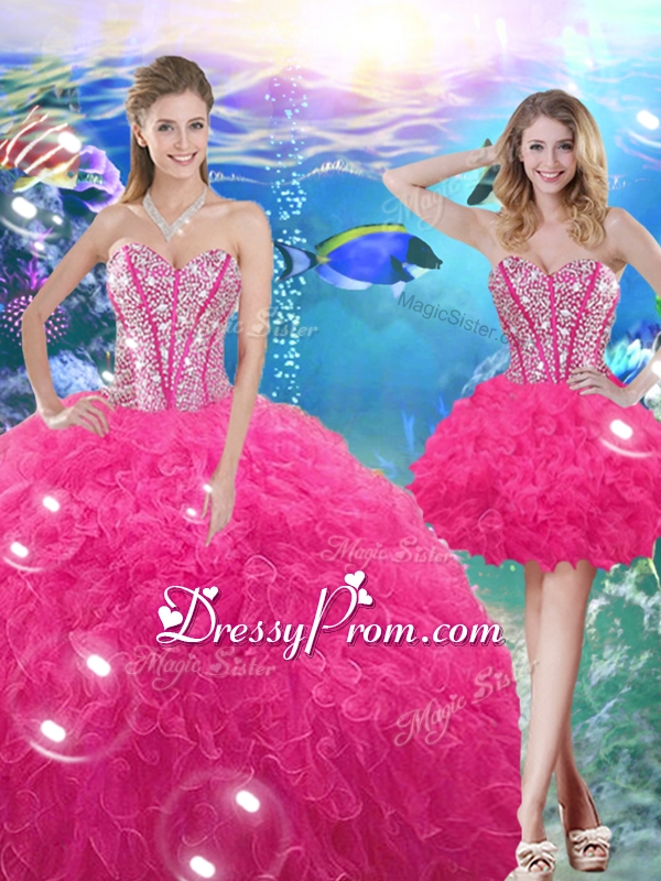 Neckline : SweetheartShown Color : Hot PinkSilhouette : Ball GownsSleeve Length : sleevelessHemline : floor lengthBack Detail : Lace upFabric : OrganzaEmbellishment : Beading,RufflesOccasion : Military Ball,Sweet 16,Quinceanera