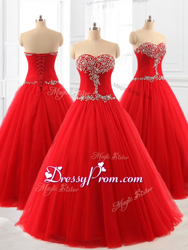 Neckline : SweetheartShown Color : RedSilhouette : Ball GownsSleeve Length : sleevelessHemline : floor lengthBack Detail : Lace upFabric : TulleOccasion : Military Ball,Sweet 16,QuinceaneraSeason : Spring,Summer,Fall,Winter