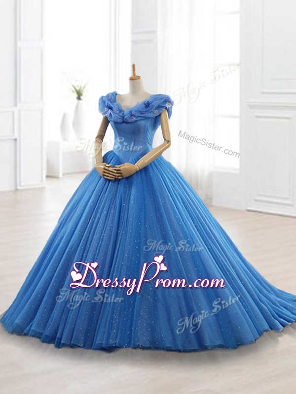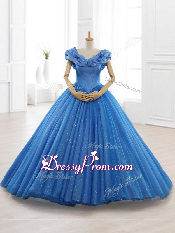 Neckline : Off the shoulder Shown Color : Blue Silhouette : Ball Gowns Sleeve Length : cap sleeves Hemline : floor length Back Detail : Lace up Fabric : Tulle Embellishment : Appliques Occasion : Military Ball,Sweet 16,Quinceanera Season : Spring,Summer,Fall,Winter