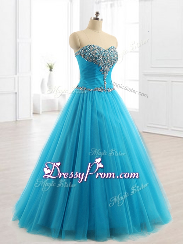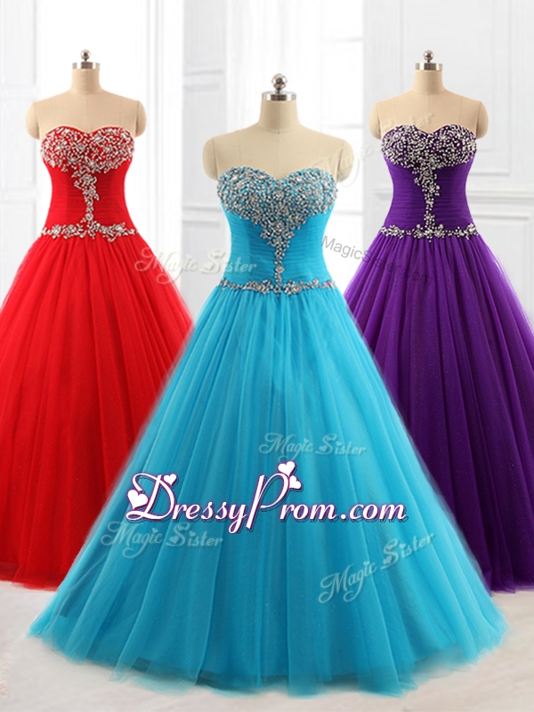 Neckline : SweetheartShown Color : Red,Aqua Blue,PurpleSilhouette : A-lineSleeve Length : sleevelessHemline : floor lengthBack Detail : Lace upFabric : TulleEmbellishment : BeadingOccasion : Military Ball,Sweet 16,QuinceaneraSeason : Spring,Summer,Fall,Winter