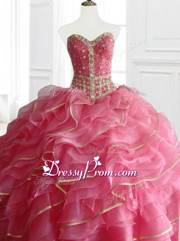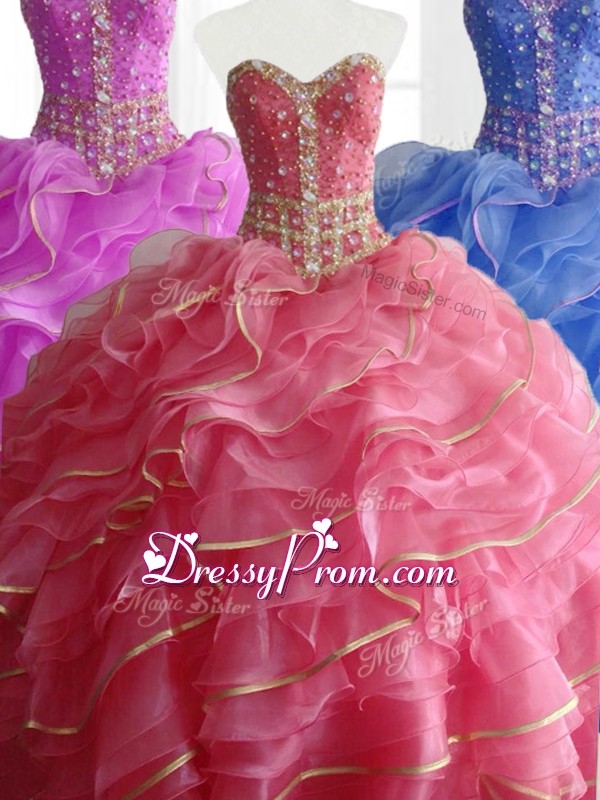 Neckline : SweetheartShown Color : Watermelon Red,Blue,FuchsiaSilhouette : Ball GownsSleeve Length : sleevelessHemline : floor lengthBack Detail : Lace upFabric : OrganzaEmbellishment : Beading,RufflesOccasion : Military Ball,Sweet 16,QuinceaneraSeason : Spring,Summer,Fall,Winter