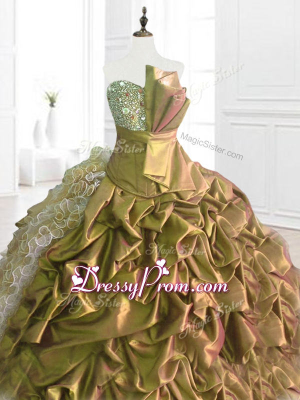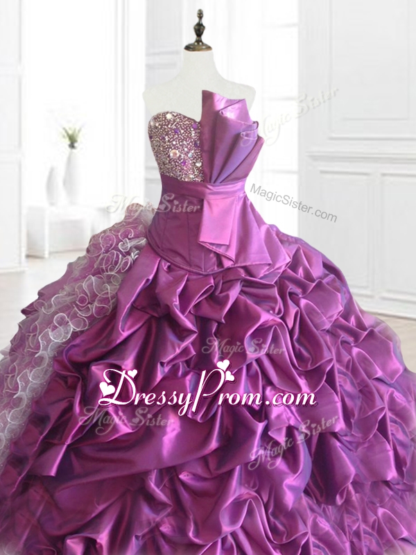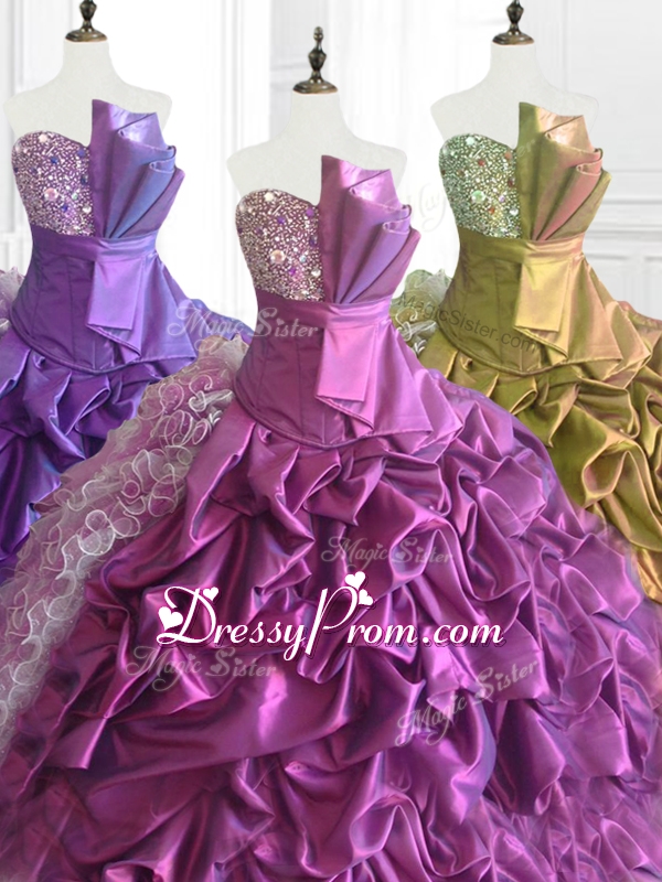 Neckline : StraplessShown Color : Eggplant Purple,Purple,BrownSilhouette : Ball GownsSleeve Length : sleevelessHemline : floor lengthBack Detail : Lace upFabric : Organza,TaffetaEmbellishment : Ruffles,Sequins,Pick UpsOccasion : Military Ball,Sweet 16,QuinceaneraSeason : Spring,Summer,Fall,Winter
