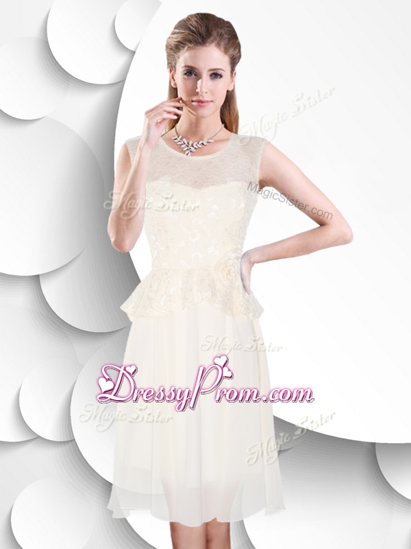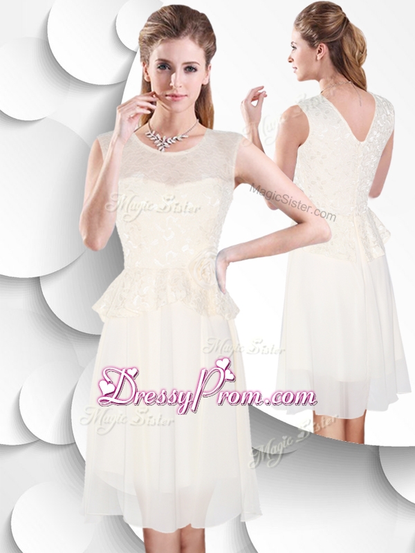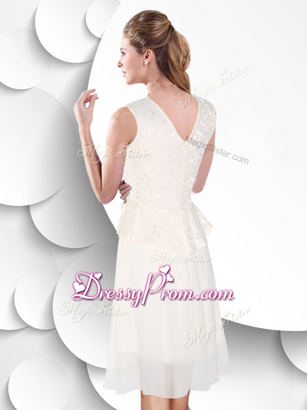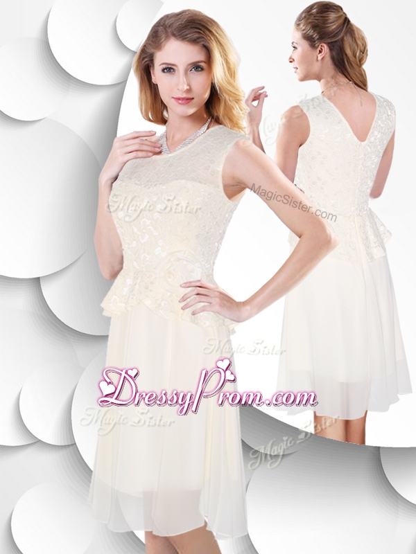 Neckline : ScoopShown Color : WhiteSilhouette : EmpireSleeve Length : sleevelessHemline : knee lengthBack Detail : ZipperFabric : ChiffonEmbellishment : Lace,Hand Made FlowerOccasion : Prom,Party,Cocktail,Homecoming,HolidaySeason : Spring,Summer,Fall