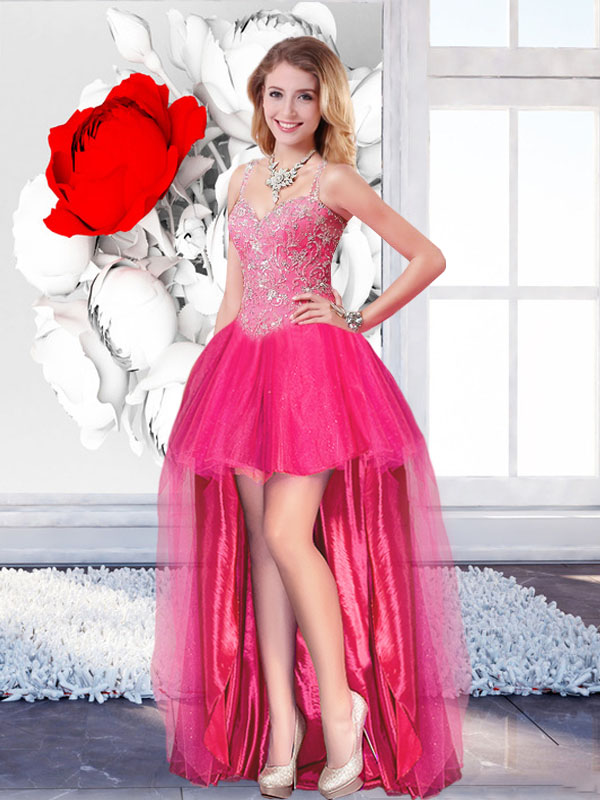 Neckline : StrapsShown Color : Hot PinkSilhouette : A-lineSleeve Length : sleevelessHemline : high lowBack Detail : Lace upFabric : TulleEmbellishment : BeadingOccasion : Prom,Party,Cocktail,Homecoming,GraduationSeason : Spring,Summer,Fall,Winter