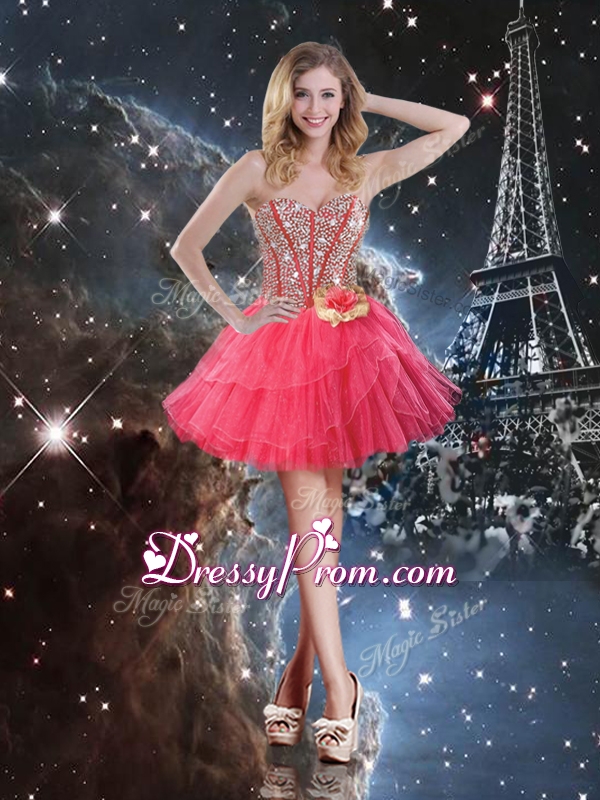 Neckline : Sweetheart Shown Color : Coral Red Sleeve Length : sleeveless Hemline : mini length Back Detail : Lace up Fabric : Organza Embellishment : Beading,Hand Made Flower Occasion : Prom,Party,Cocktail,Homecoming,Graduation Season : Spring,Summer,Fall