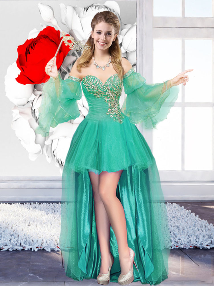 Neckline : SweetheartShown Color : TurquoiseSleeve Length : sleevelessHemline : high lowBack Detail : Lace upFabric : TulleEmbellishment : BeadingOccasion : Prom,Graduation,PageantSeason : Spring,Summer,Fall,Winter