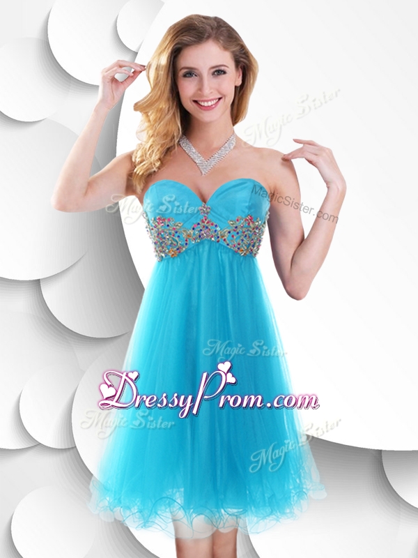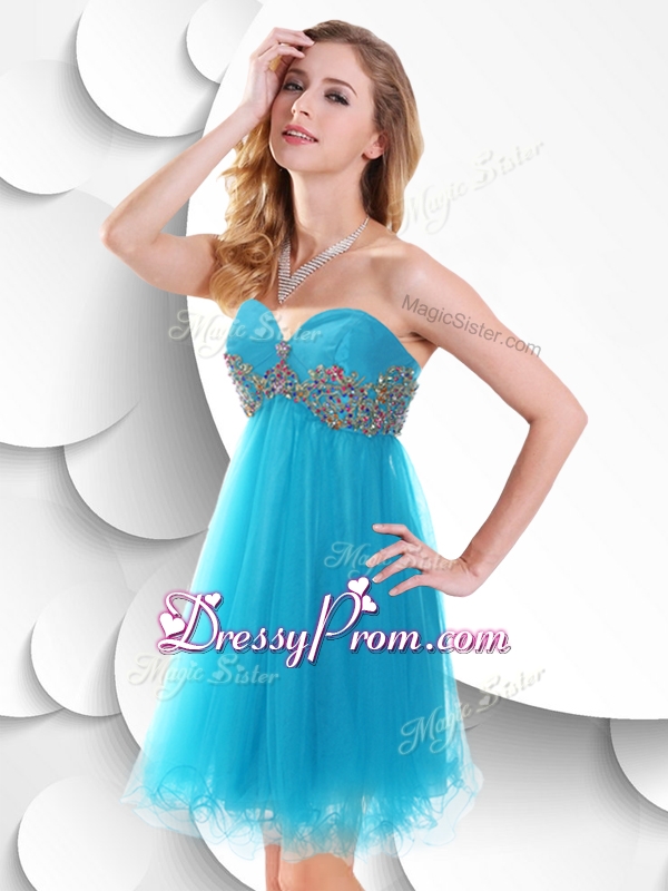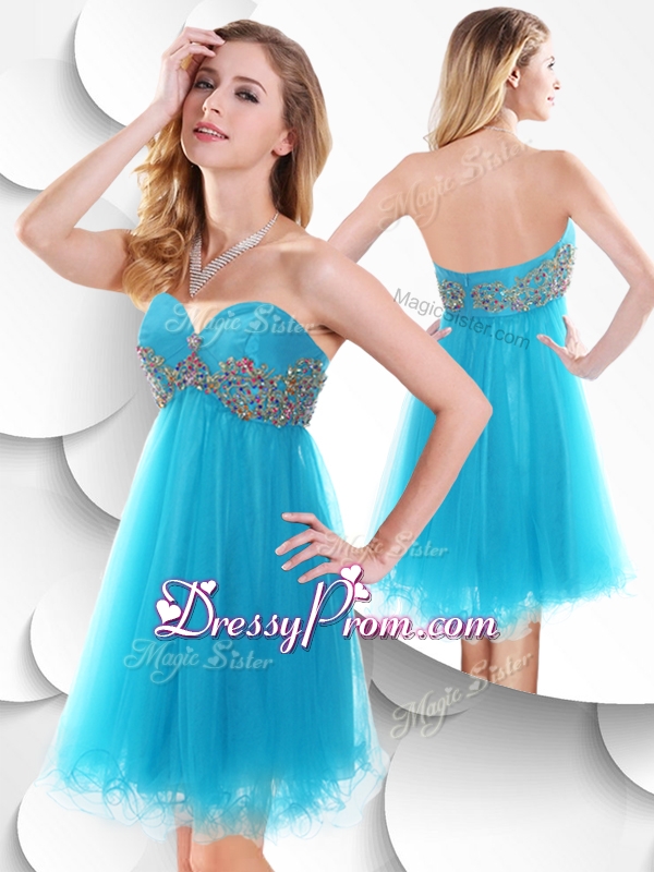 Neckline : SweetheartShown Color : Baby BlueSilhouette : ShortSleeve Length : sleevelessHemline : mini lengthBack Detail : ZipperFabric : OrganzaEmbellishment : BeadingOccasion : Prom,Party,Cocktail,Homecoming,GraduationSeason : Spring,Summer,Fall