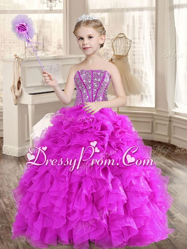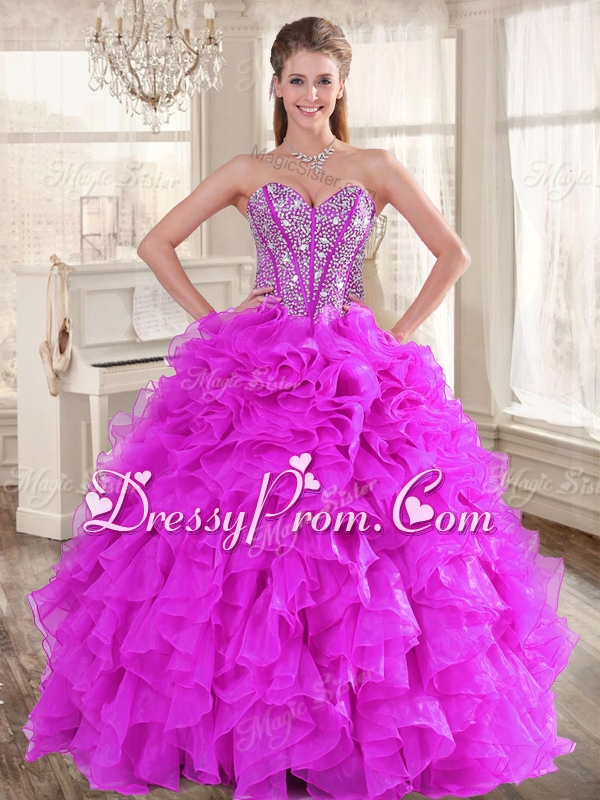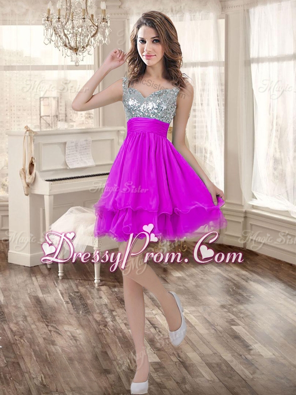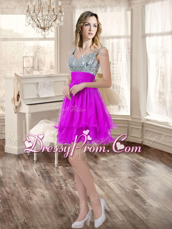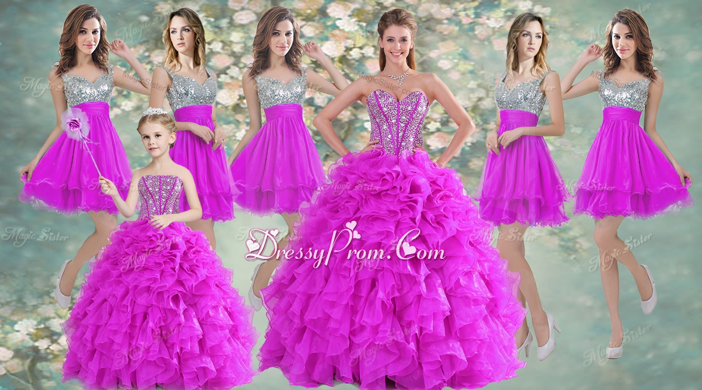 Visible Boning Fuchsia Sweet 16 Gown and Sequined Dama Dresses Beaded and Ruffled Mini Quinceanera Dress