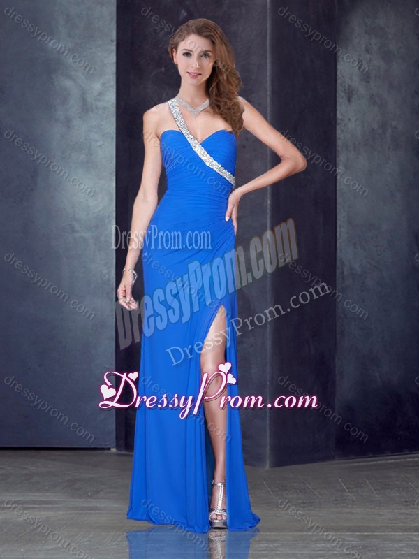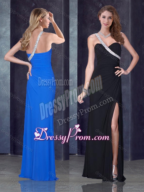 Neckline : One shoulderShown Color : Black,BlueSilhouette : Column/SheathSleeve Length : sleevelessHemline : floor lengthBack Detail : Side zipperFabric : Elastic Woven SatinEmbellishment : BeadingOccasion : Prom,Party,Cocktail,Homecoming,GraduationSeason : Spring,Summer,Fall,Winter