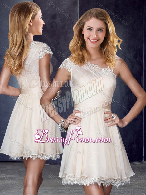 Neckline : One shoulderShown Color : ChampagneSilhouette : ShortSleeve Length : sleevelessHemline : mini lengthBack Detail : Side zipperFabric : ChiffonEmbellishment : Lace,BeltOccasion : Prom,Party,Cocktail,Homecoming,GraduationSeason : Spring,Summer,Fall